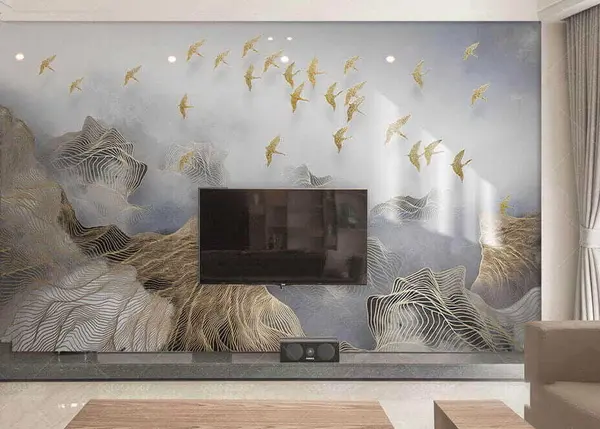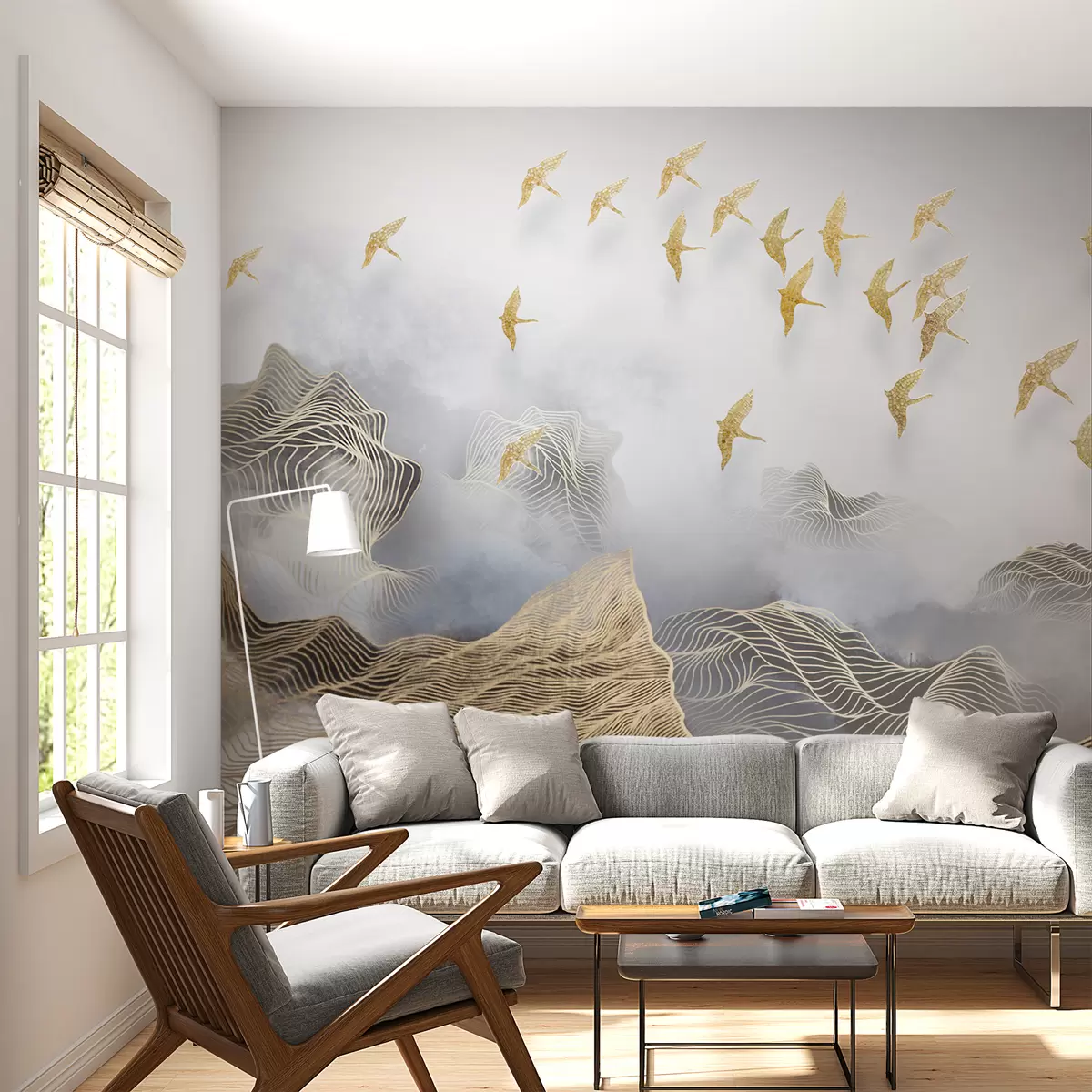 Тапете за зид Из танких линија нацртан је диван пејзаж са планинама и птицама бр. u44870