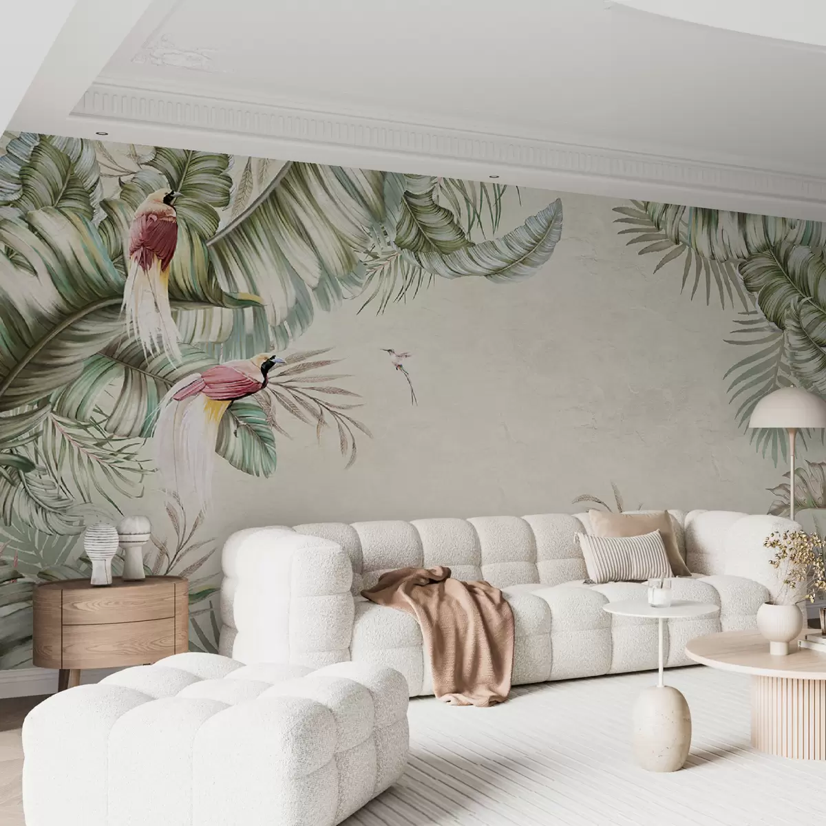 Тапете за зид Тропске биљке и птице на текстурираној позадини бр. u96550