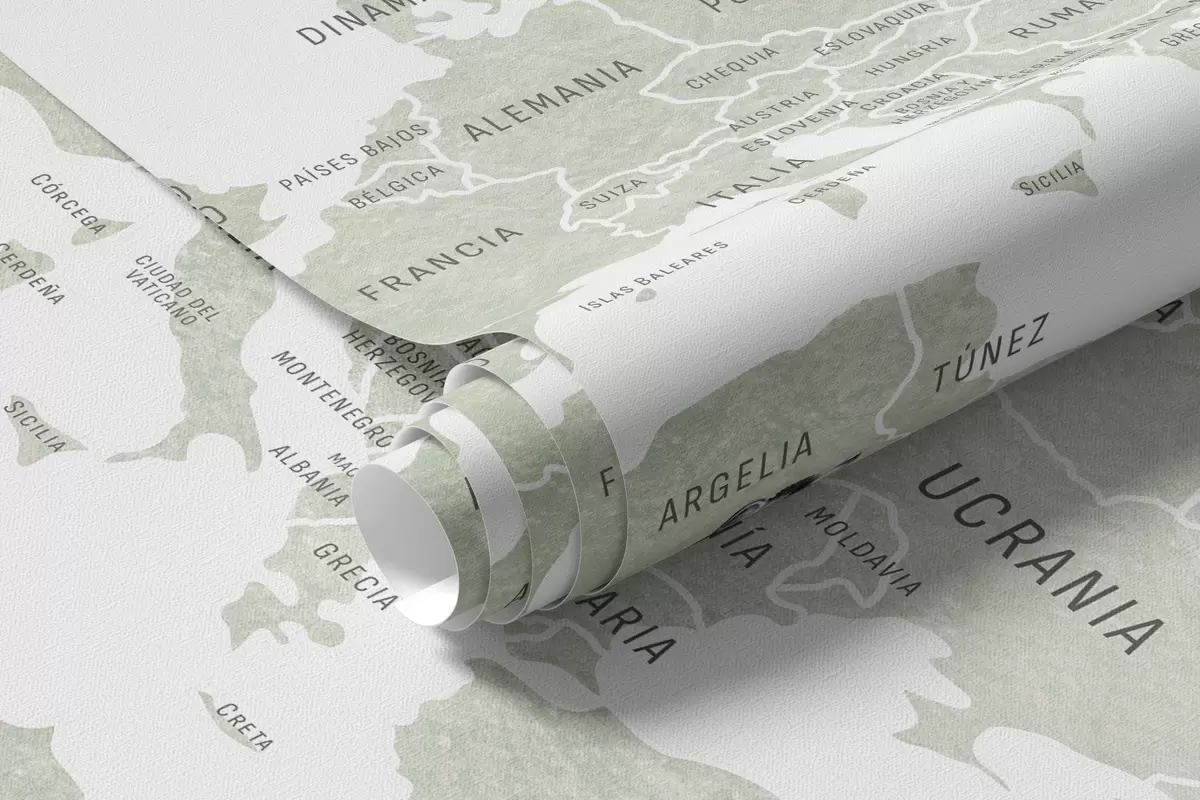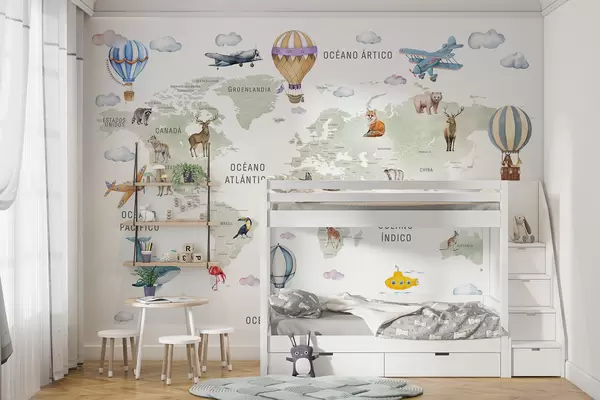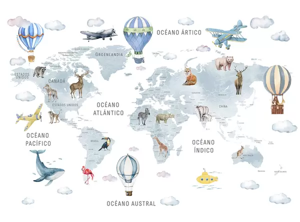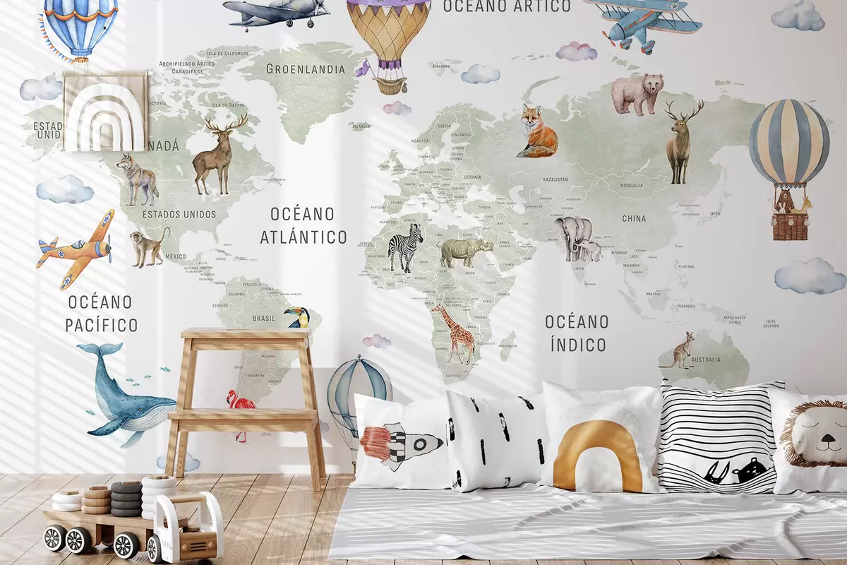 Тапете за зид Дечја мапа у акварел стилу са животињама и балонима на врући ваздух. Шпански језик. Зелена боја. бр. c00001es