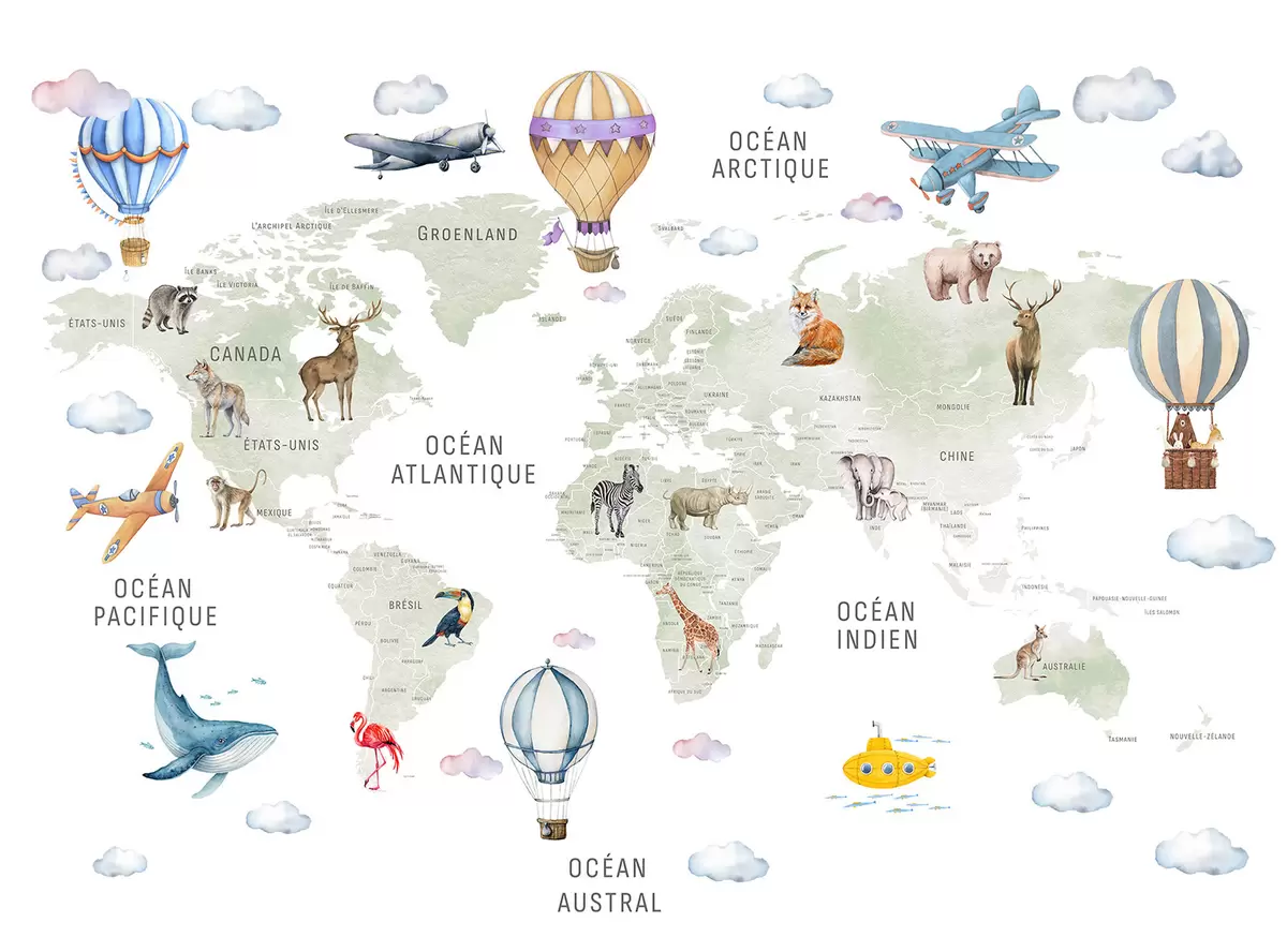 Тапете за зид Дечја мапа у акварел стилу са животињама и балонима на врући ваздух. Француски језик. Зелена боја. бр. c00001fr