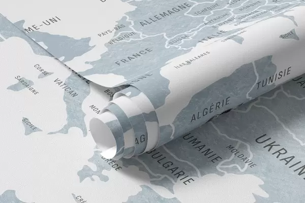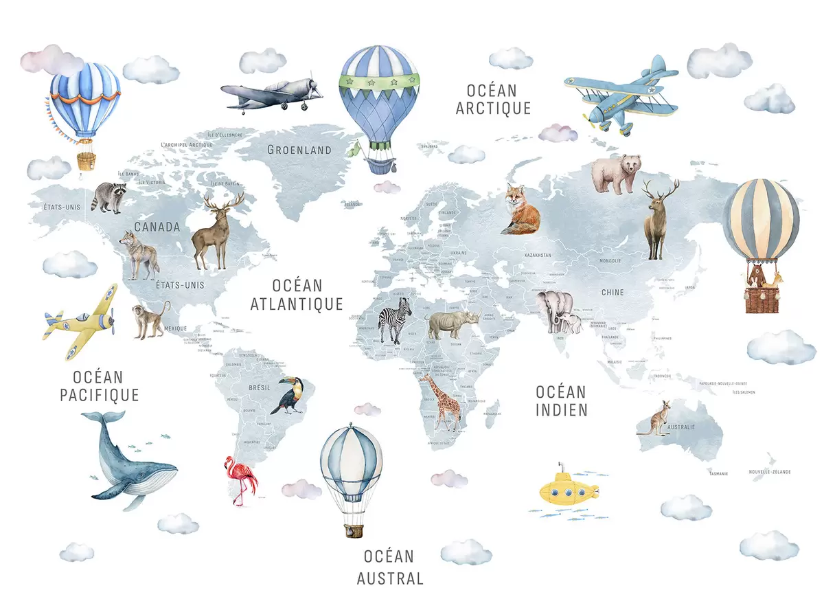 Тапете за зид Дечја мапа у акварел стилу са животињама и балонима на врући ваздух. Француски језик. Плава боја. бр. c00001frv1