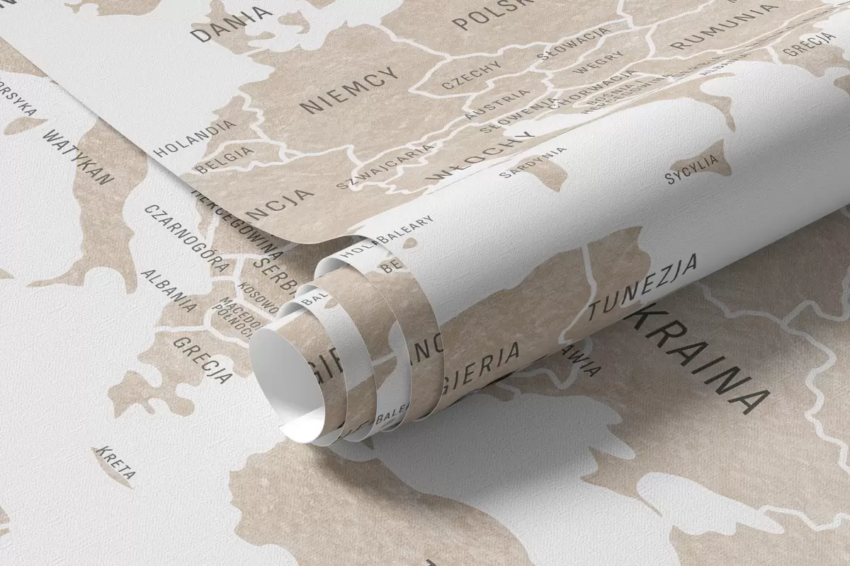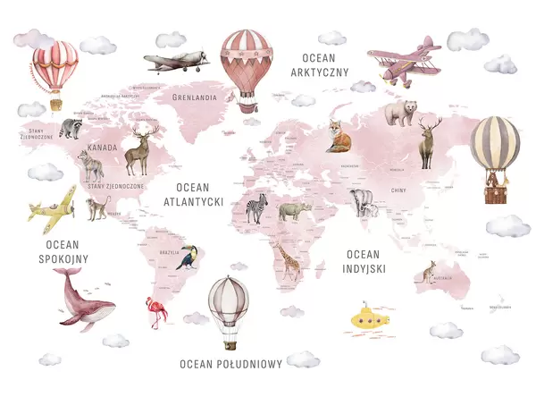 Тапете за зид Дечја мапа у акварел стилу са животињама и балонима на врући ваздух. Пољски језик. Беж боја. бр. c00001plv2