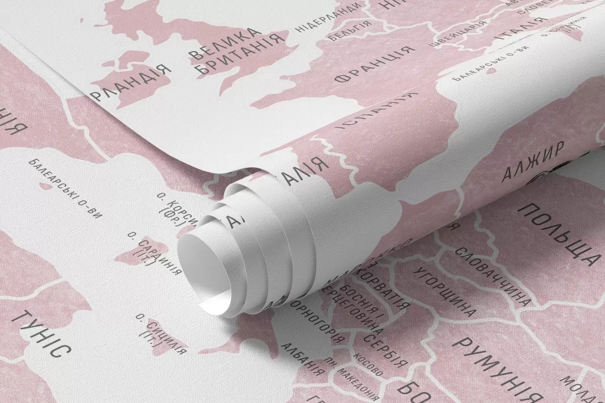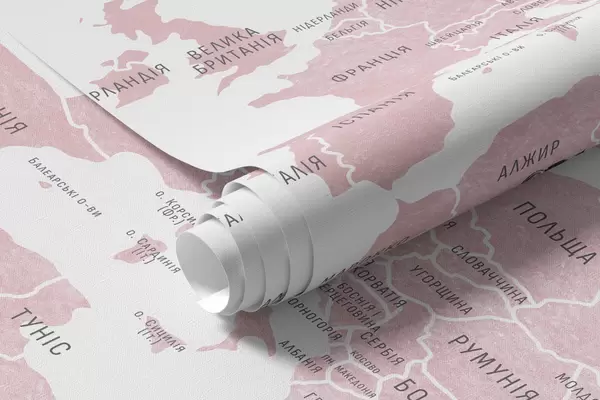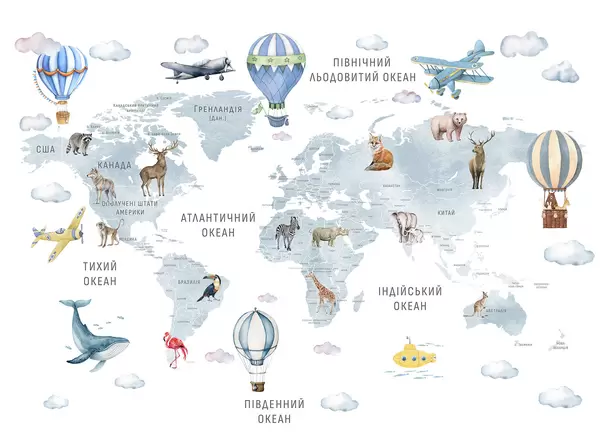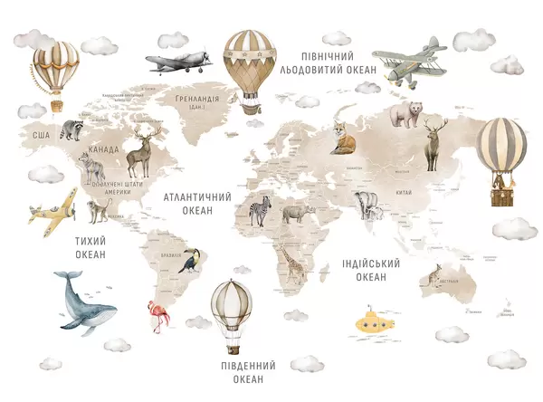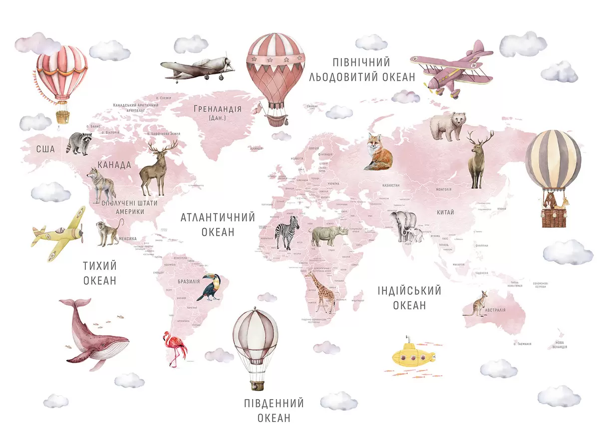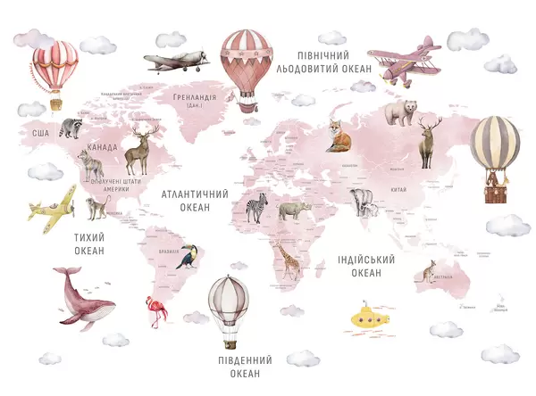 Тапете за зид Дечја мапа у акварел стилу са животињама и балонима на врући ваздух. Украјински језик. Розе боја. бр. c00001ukv3