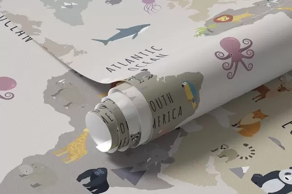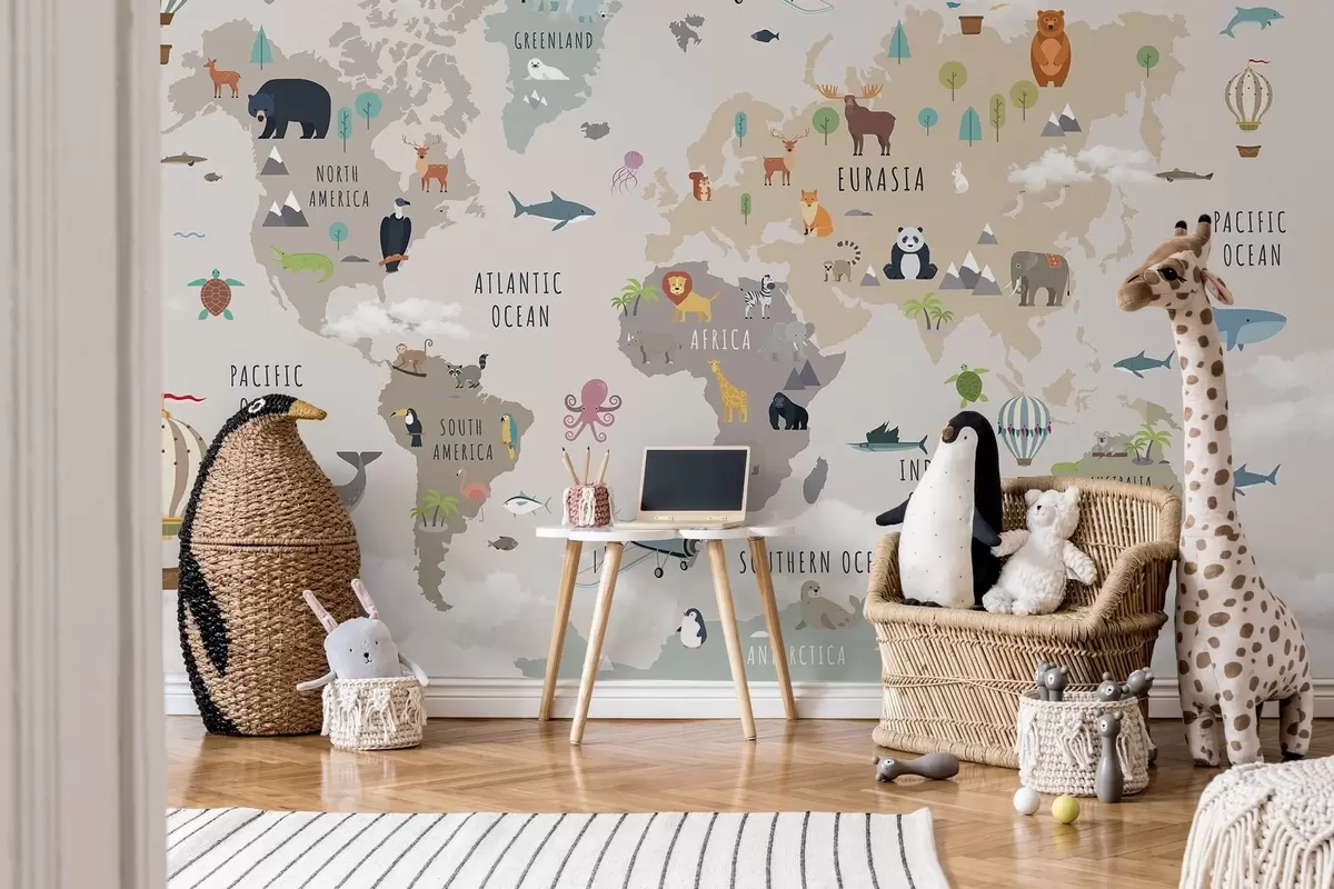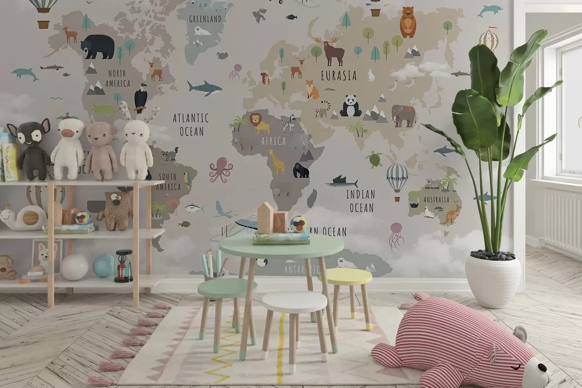Тапете за зид Дечја мапа света са животињама и балонима на врући ваздух. Енглески језик. бр. c00002en