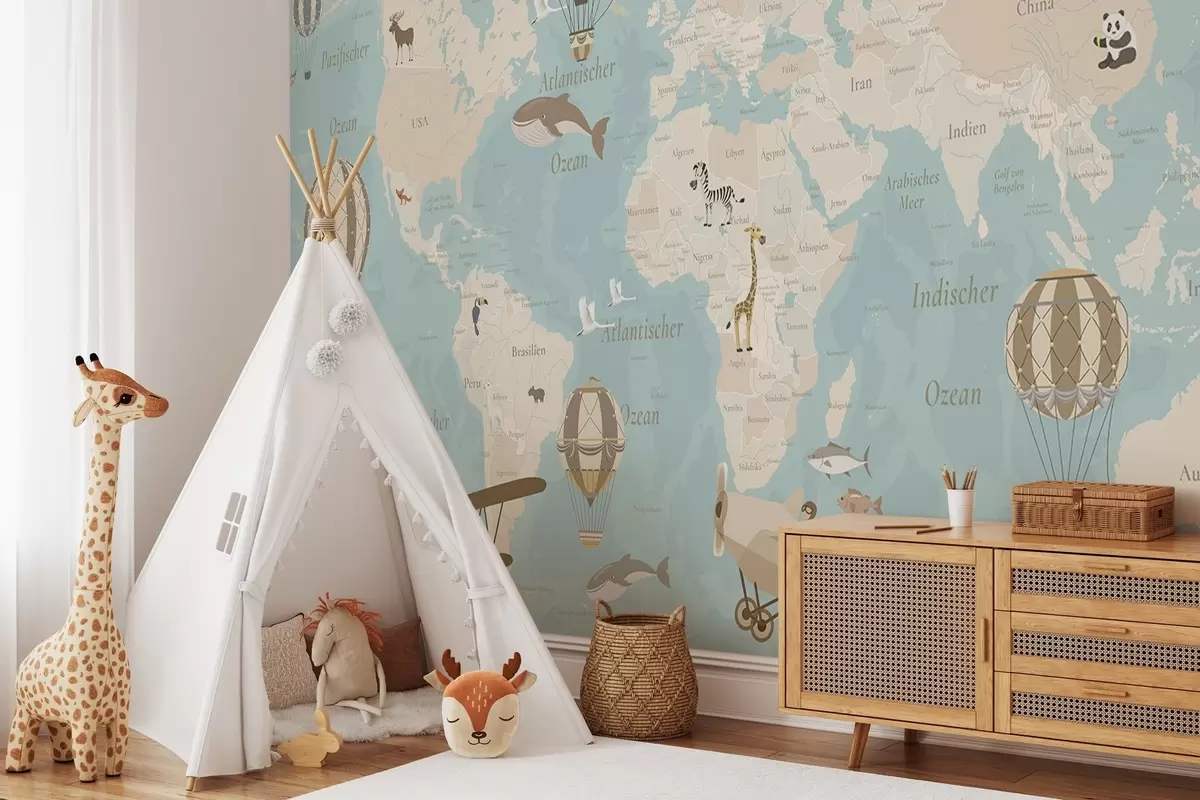Тапете за зид Дечја мапа света са животињама, авионима и балонима на врући ваздух. Немачки језик. Плава боја. бр. c00003dev1