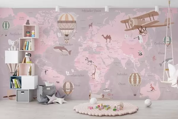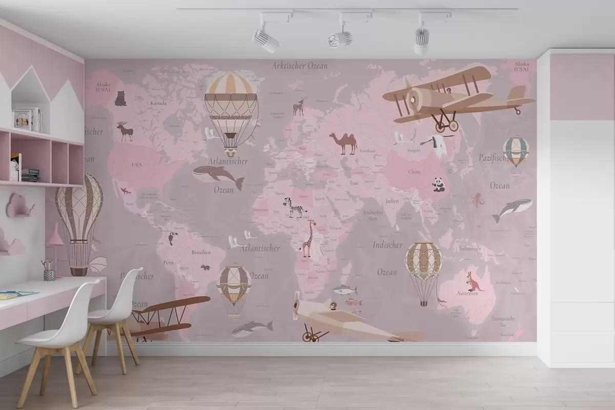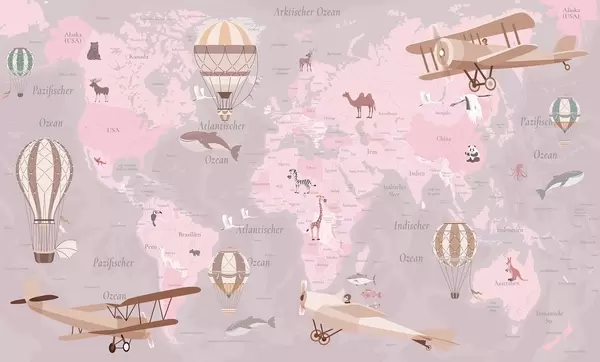 Тапете за зид Дечја мапа света са животињама, авионима и балонима на врући ваздух. Немачки језик. Розе боја. бр. c00003dev3