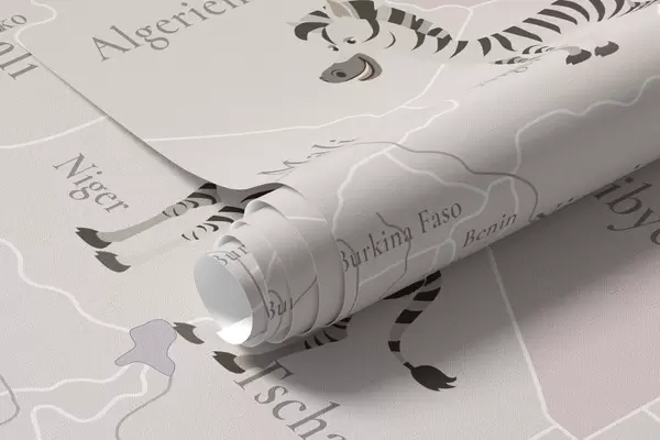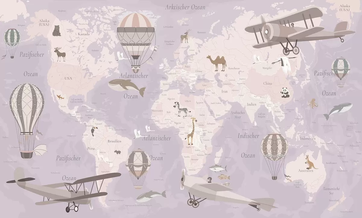 Тапете за зид Дечја мапа света са животињама, авионима и балонима на врући ваздух. Немачки језик. Љубичаста боја. бр. c00003dev4
