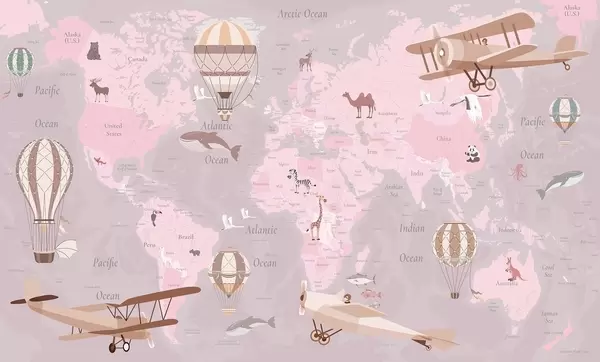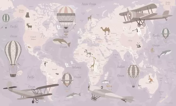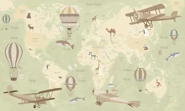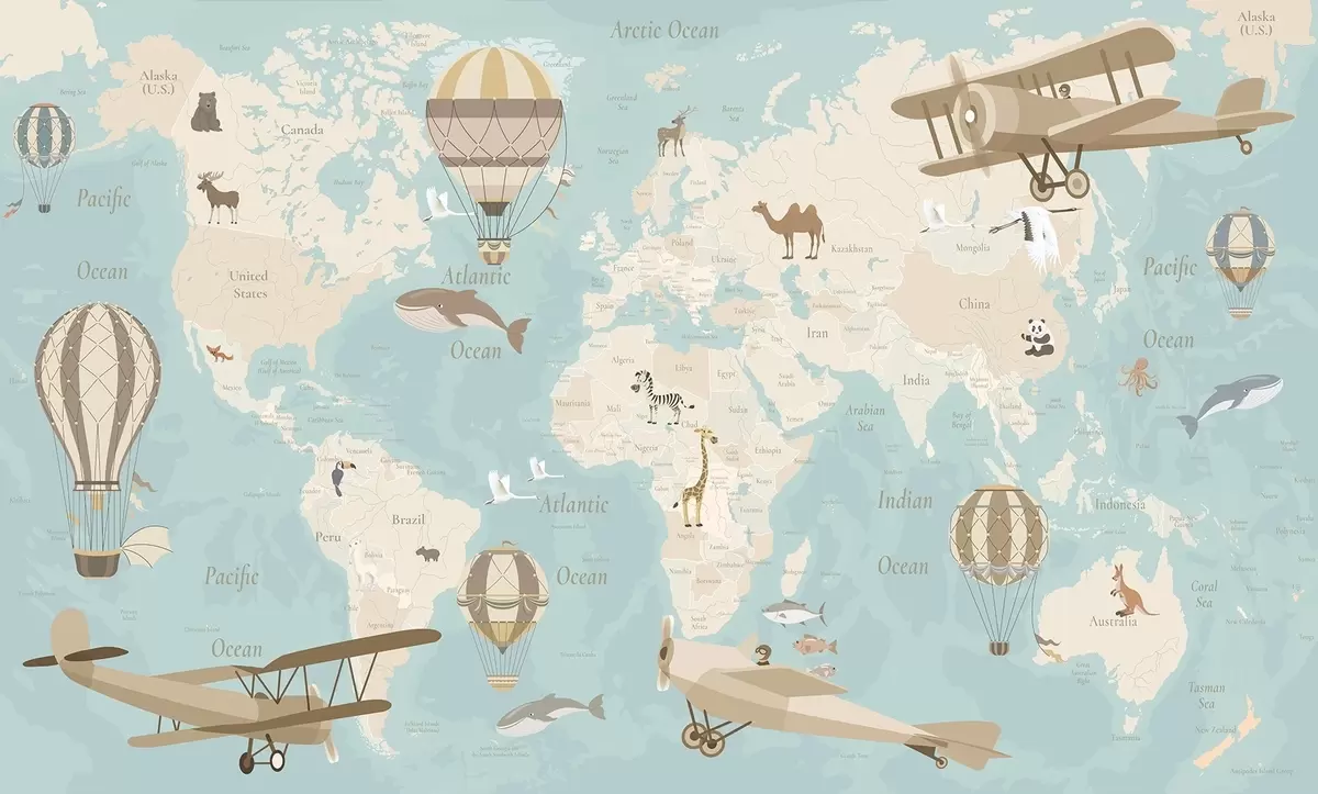 Тапете за зид Дечја мапа света са животињама, авионима и балонима на врући ваздух. Енглески језик. Плава боја. бр. c00003env1