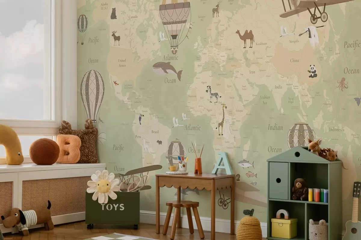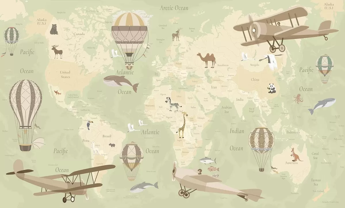 Тапете за зид Дечја мапа света са животињама, авионима и балонима на врући ваздух. Енглески језик. Зелена боја. бр. c00003env2