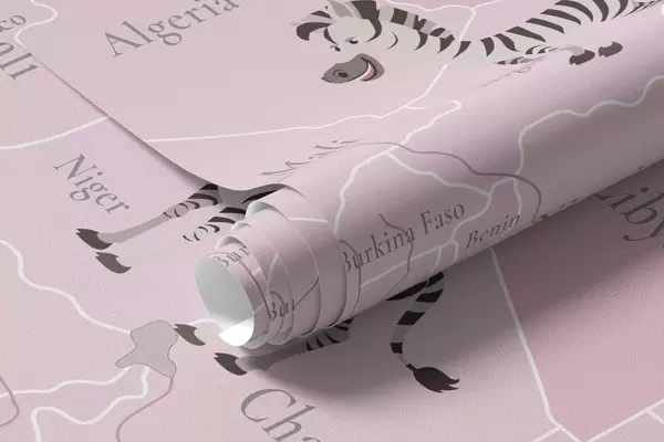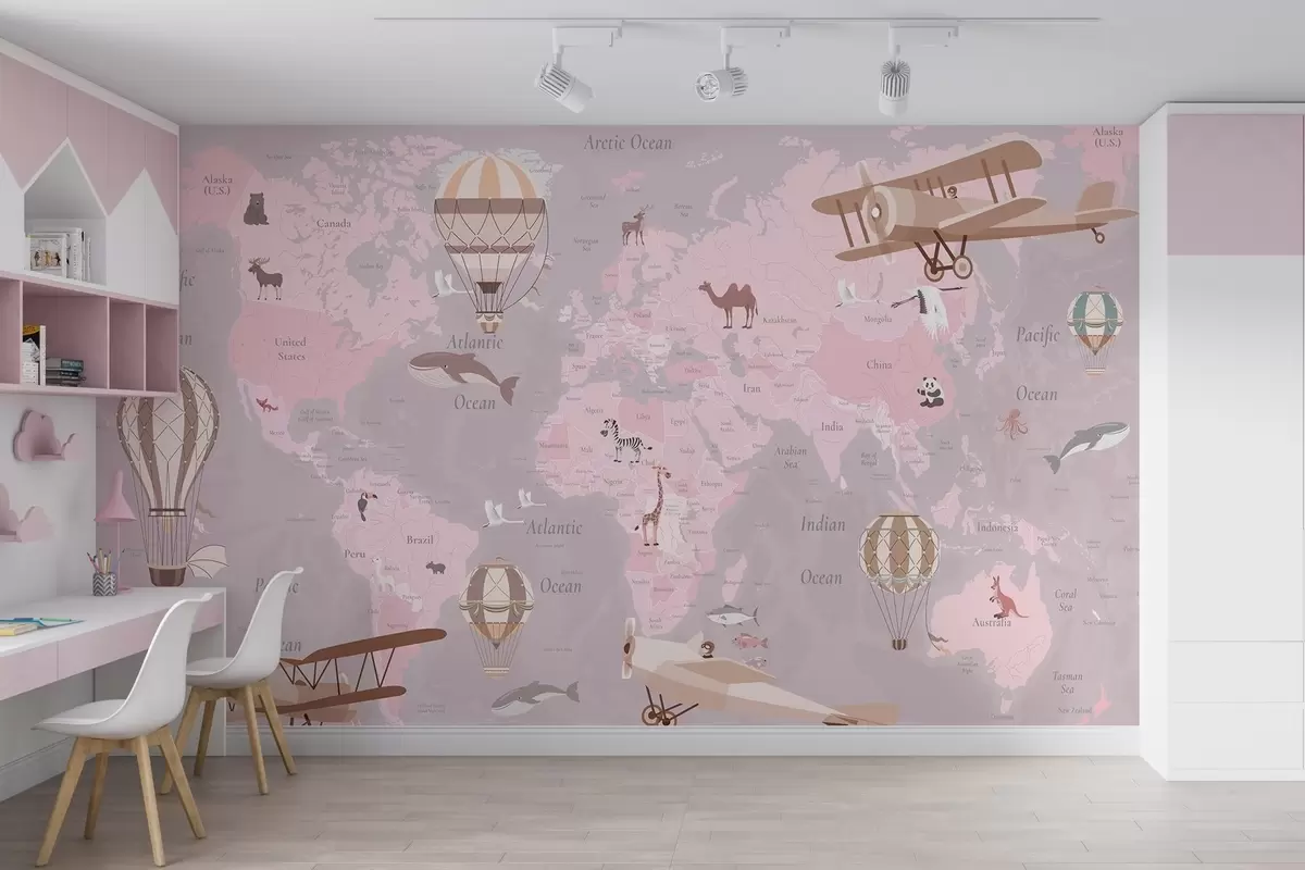 Тапете за зид Дечја мапа света са животињама, авионима и балонима на врући ваздух. Енглески језик. Розе боја. бр. c00003env3