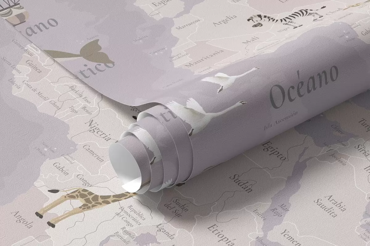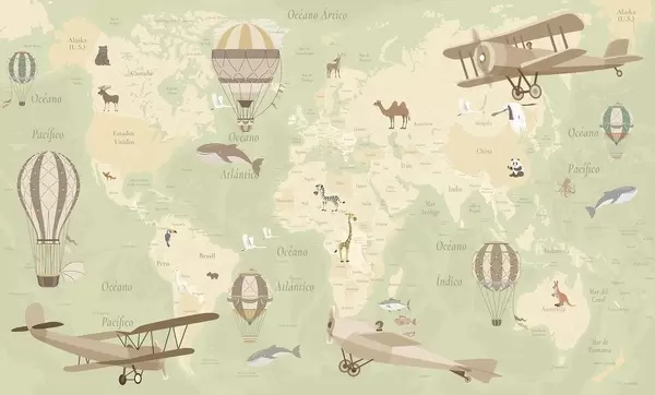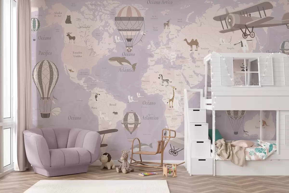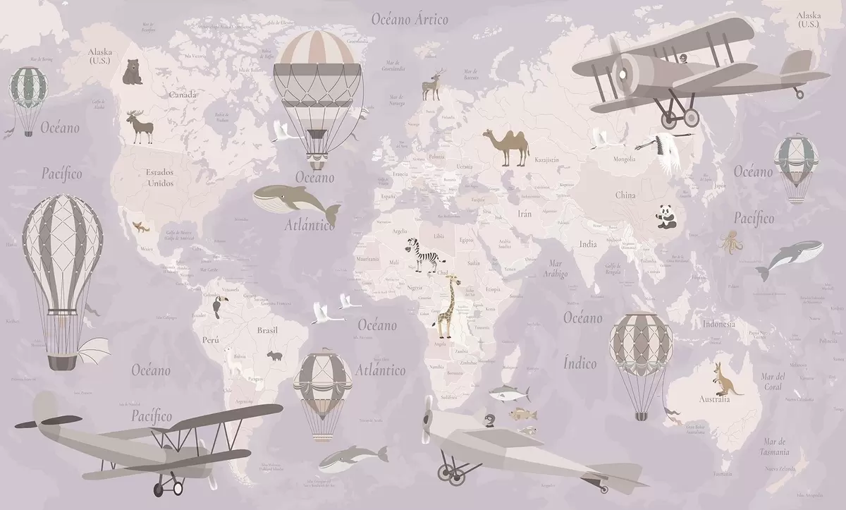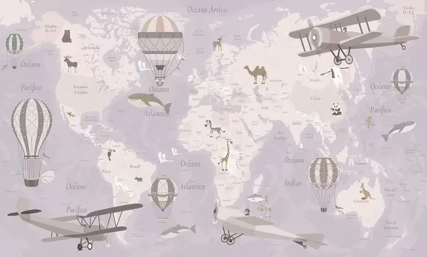 Тапете за зид Дечја мапа света са животињама, авионима и балонима на врући ваздух. Шпански језик. Љубичаста боја. бр. c00003esv4