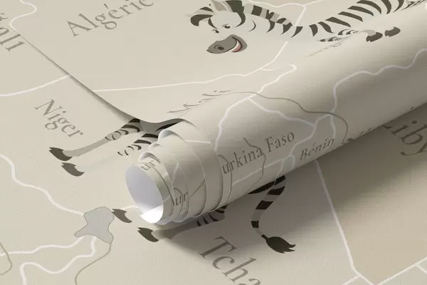Тапете за зид Дечја мапа света са животињама, авионима и балонима на врући ваздух. Француски језик. Беж боја. бр. c00003fr