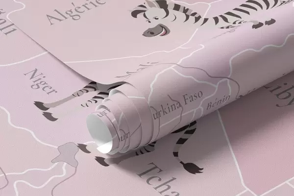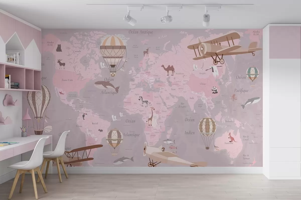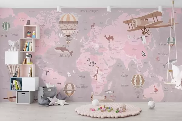 Тапете за зид Дечја мапа света са животињама, авионима и балонима на врући ваздух. Француски језик. Ружичаста боја. бр. c00003frv3