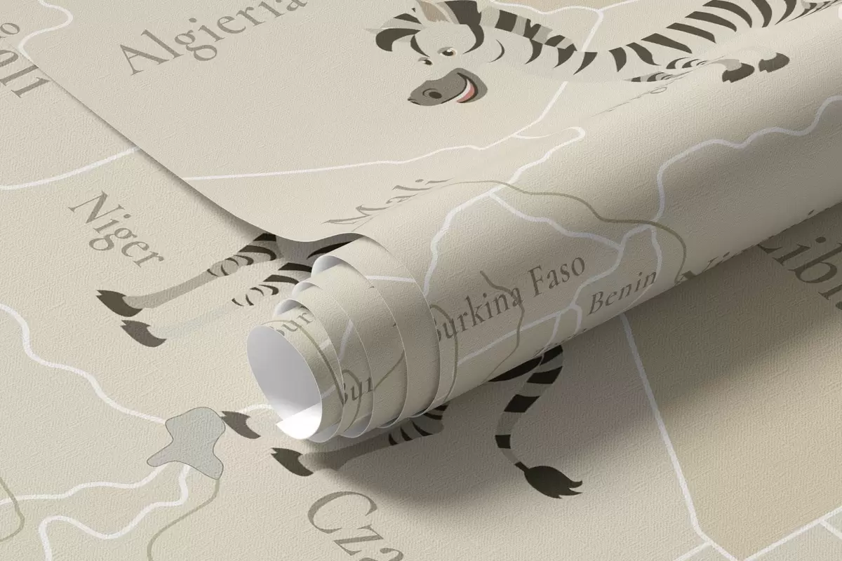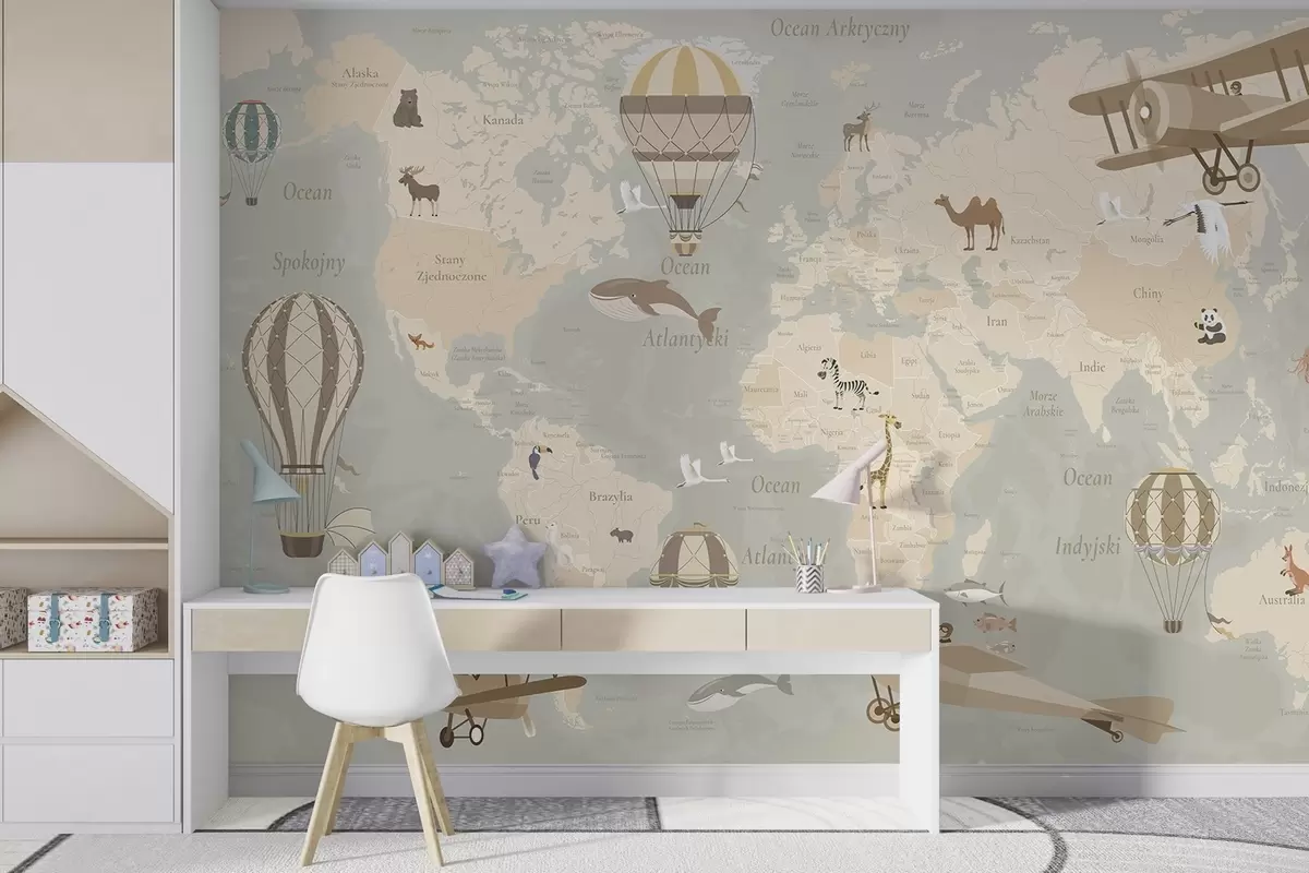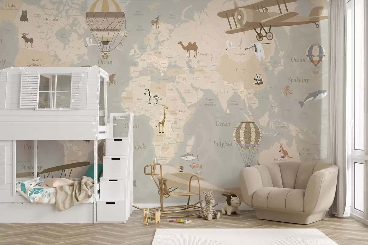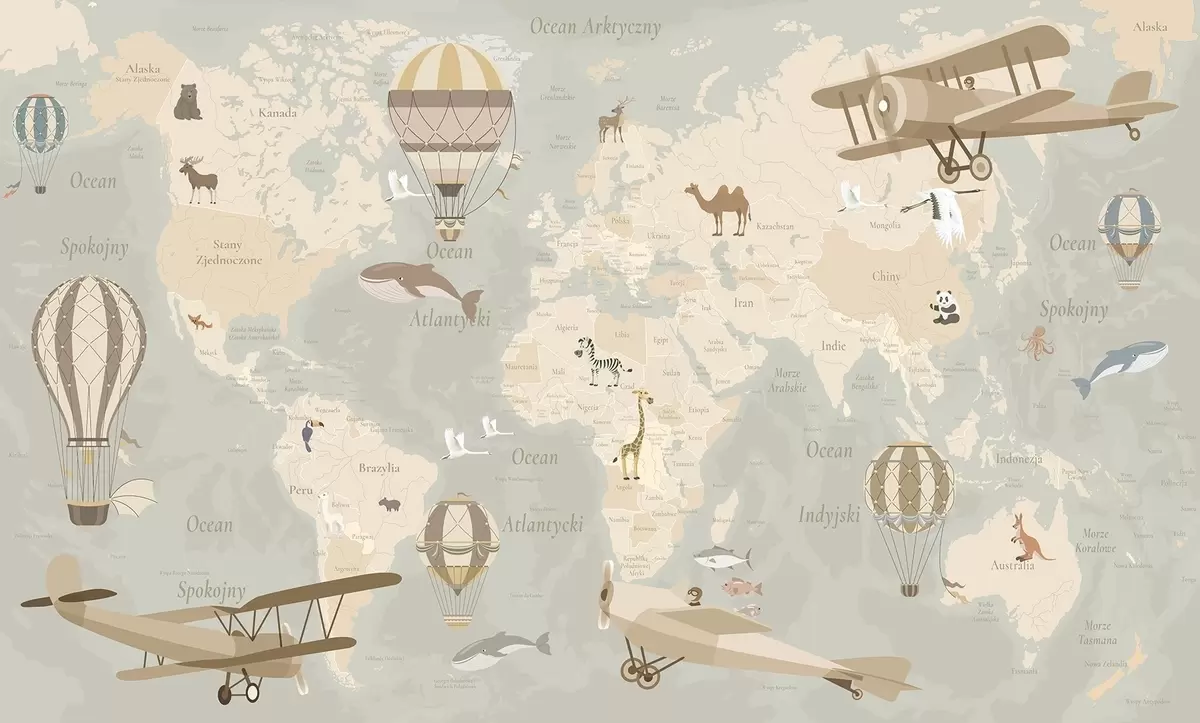 Тапете за зид Дечја мапа света са животињама, авионима и балонима на врући ваздух. Пољски језик. Беж боја. бр. c00003pl
