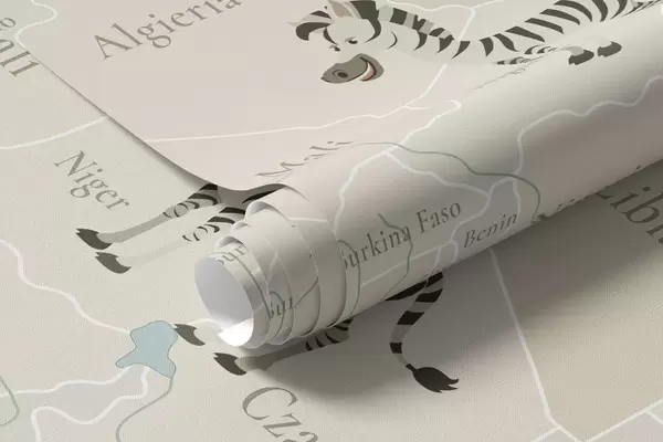 Тапете за зид Дечја мапа света са животињама, авионима и балонима на врући ваздух. Пољски језик. Плава боја. бр. c00003plv1