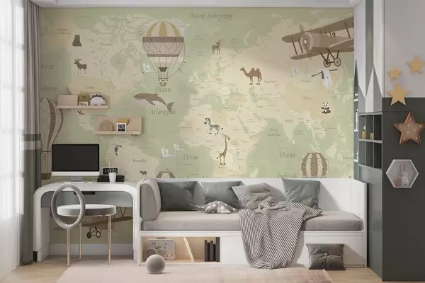 Тапете за зид Дечја мапа света са животињама, авионима и балонима на врући ваздух. Пољски језик. Зелена боја. бр. c00003plv2