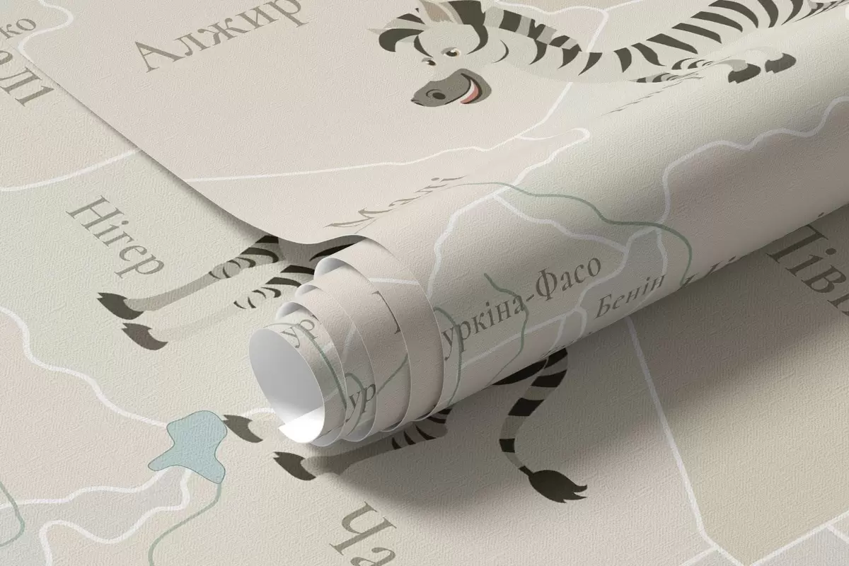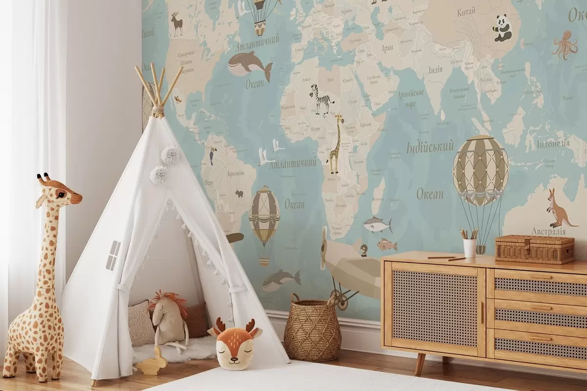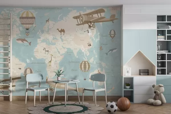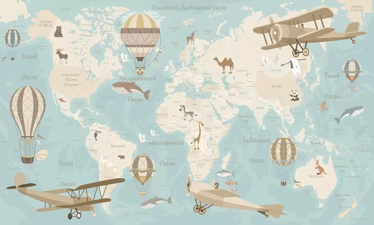 Тапете за зид Дечја мапа света са животињама, авионима и балонима на врући ваздух. Украјински језик. Плава боја бр. c00003ukv1