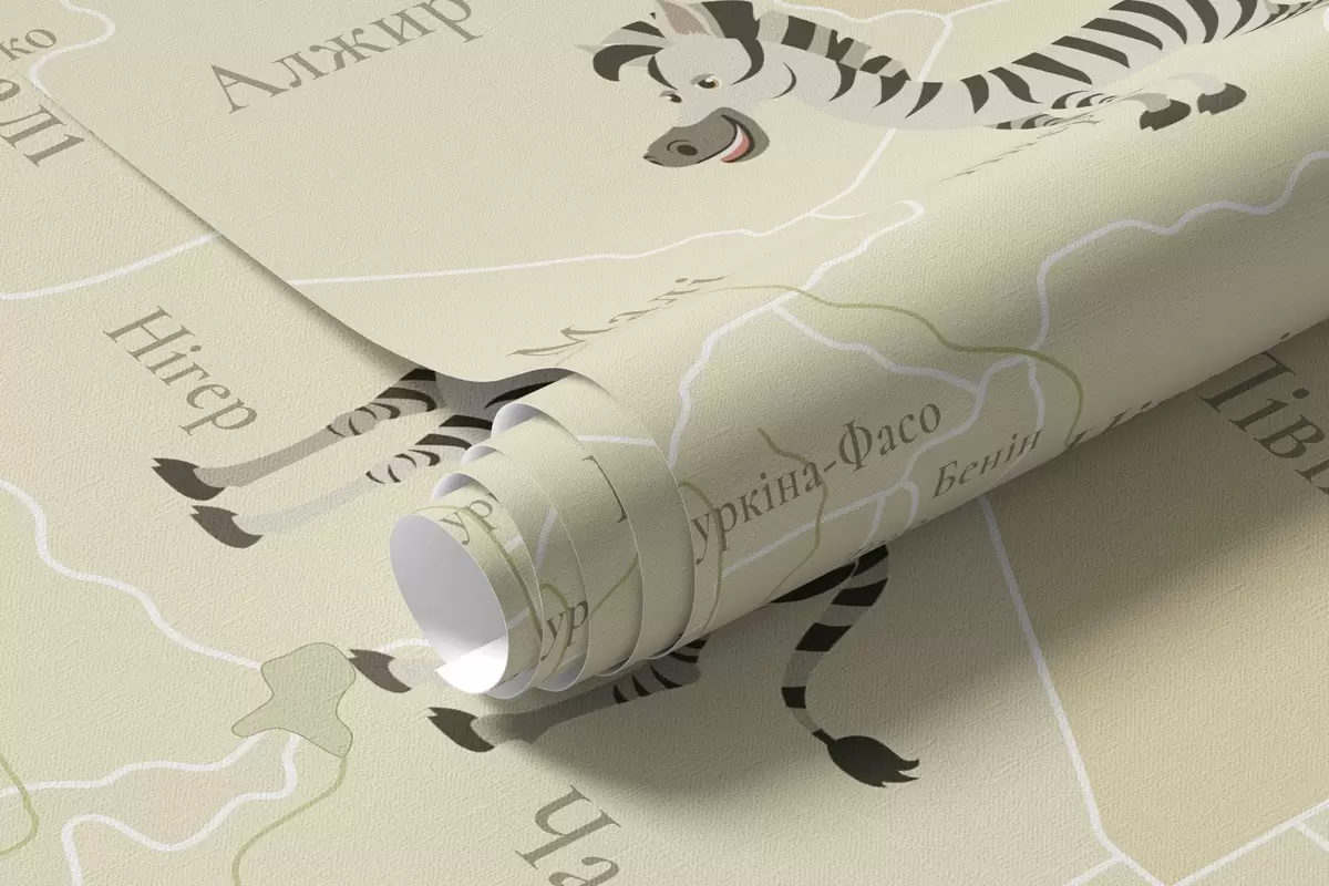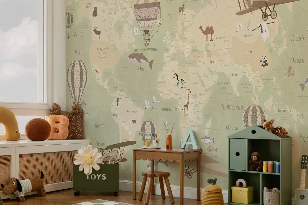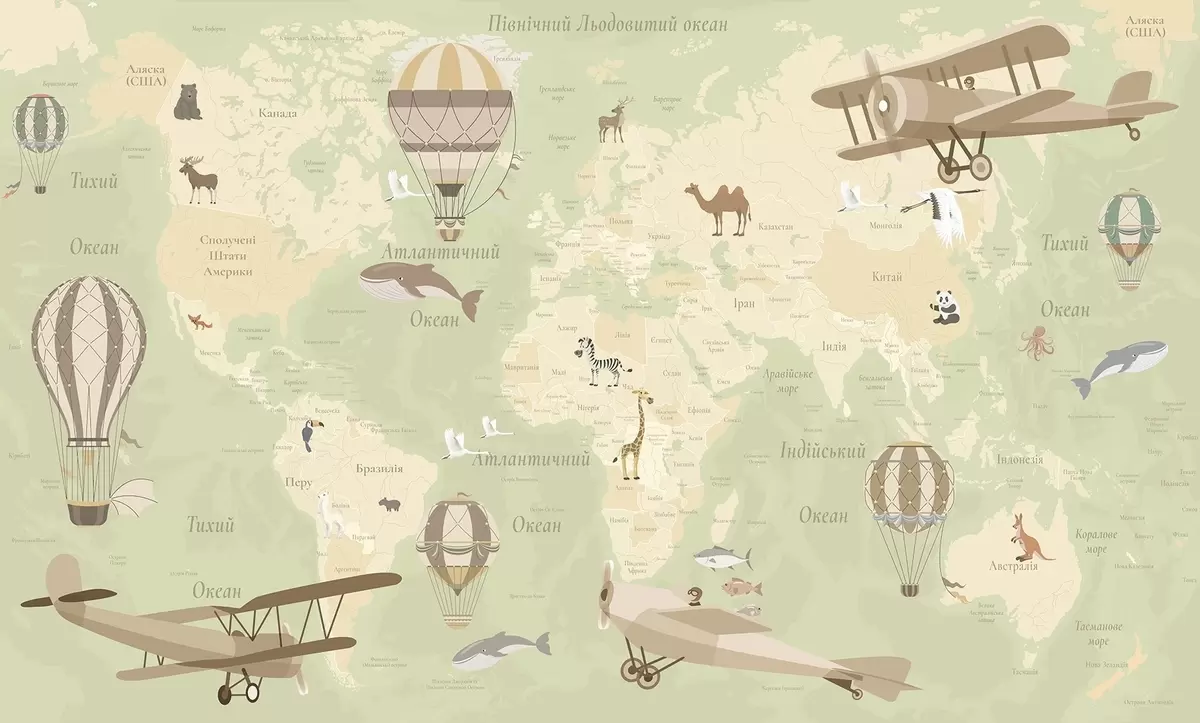 Тапете за зид Дечја мапа света са животињама, авионима и балонима на врући ваздух. Украјински језик. Зелена боја. бр. c00003ukv2