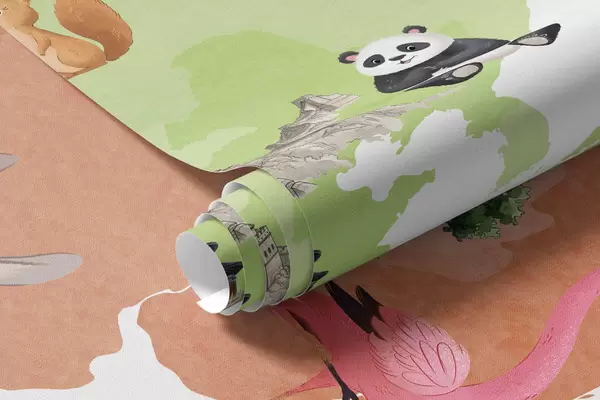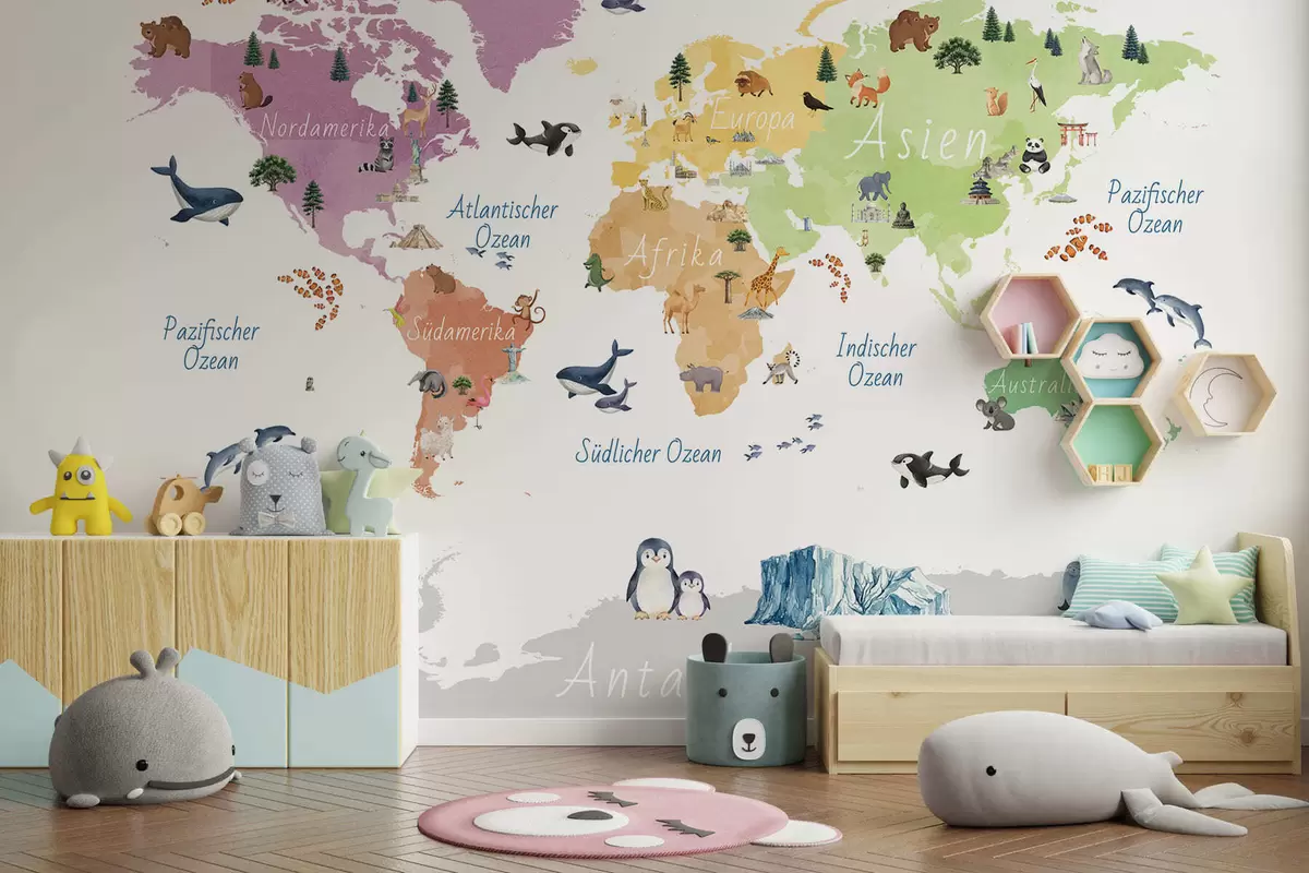 Тапете за зид Мапа у боји у акварелу са животињама, биљкама и архитектуром. Ознаке на немачком језику. бр. c00009de