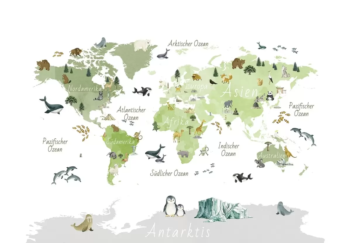 Тапете за зид Зелена мапа у акварелу са животињама, биљкама и архитектуром. Ознаке на немачком језику. бр. c00009dev2