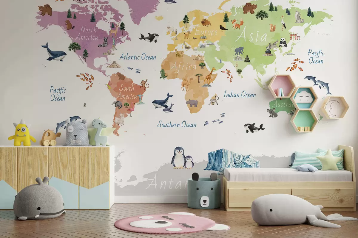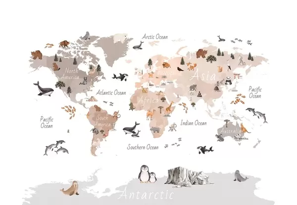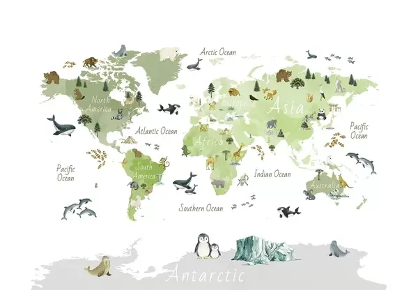 Тапете за зид Мапа у боји у акварел стилу са животињама, биљкама и архитектуром. Ознаке на енглеском језику. бр. c00009en
