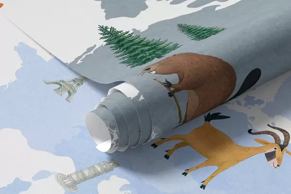 Тапете за зид Плава мапа у акварелу са животињама, биљкама и архитектуром. Ознаке на шпанском. бр. c00009esv1