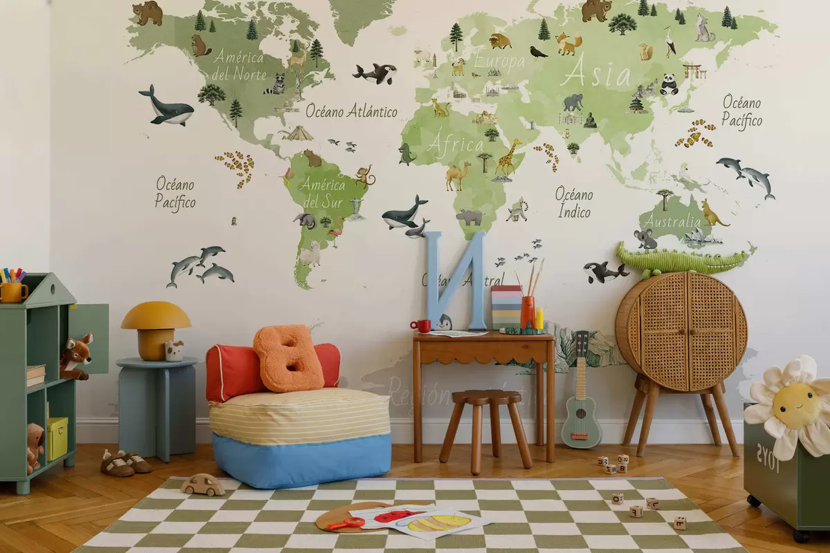 Тапете за зид Зелена мапа у акварелу са животињама, биљкама и архитектуром. Ознаке на шпанском. бр. c00009esv2