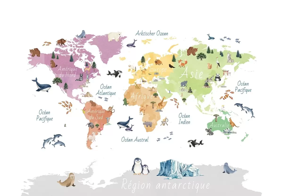 Тапете за зид Мапа у боји у акварелном стилу са животињама, биљкама и архитектуром. Ознаке на француском језику. бр. c00009fr