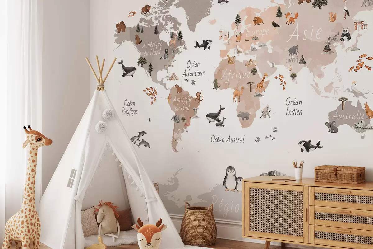 Тапете за зид Беж мапа у акварелу са животињама, биљкама и архитектуром. Ознаке на француском. бр. c00009frv3
