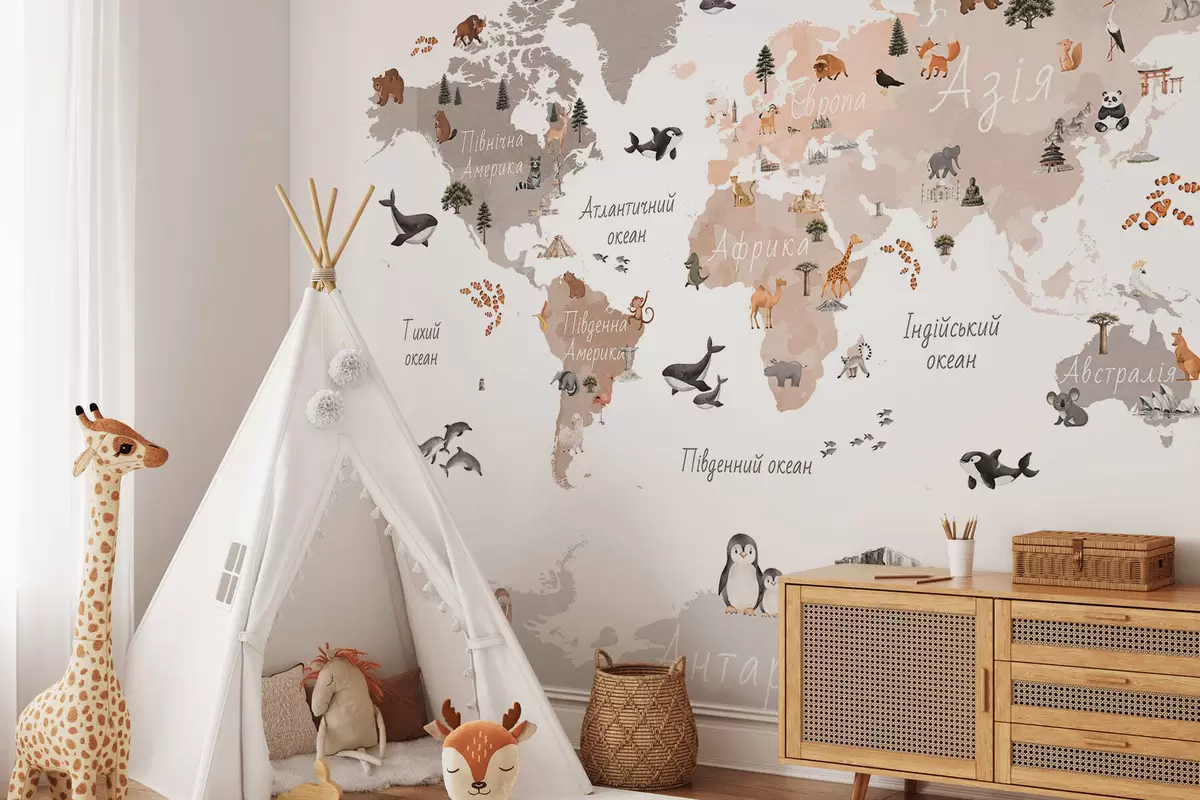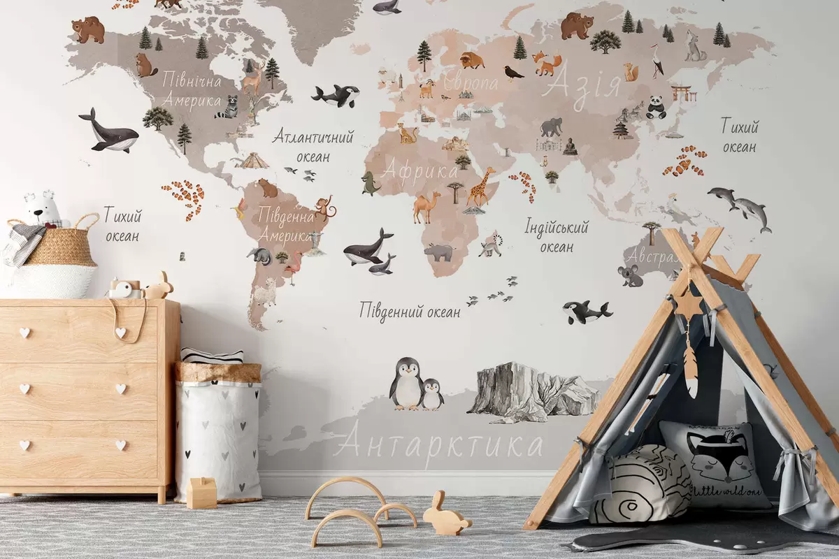 Тапете за зид Беж мапа у акварелу са животињама, биљкама и архитектуром. Ознаке на украјинском језику. бр. c00009ukv3