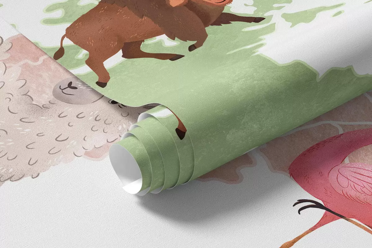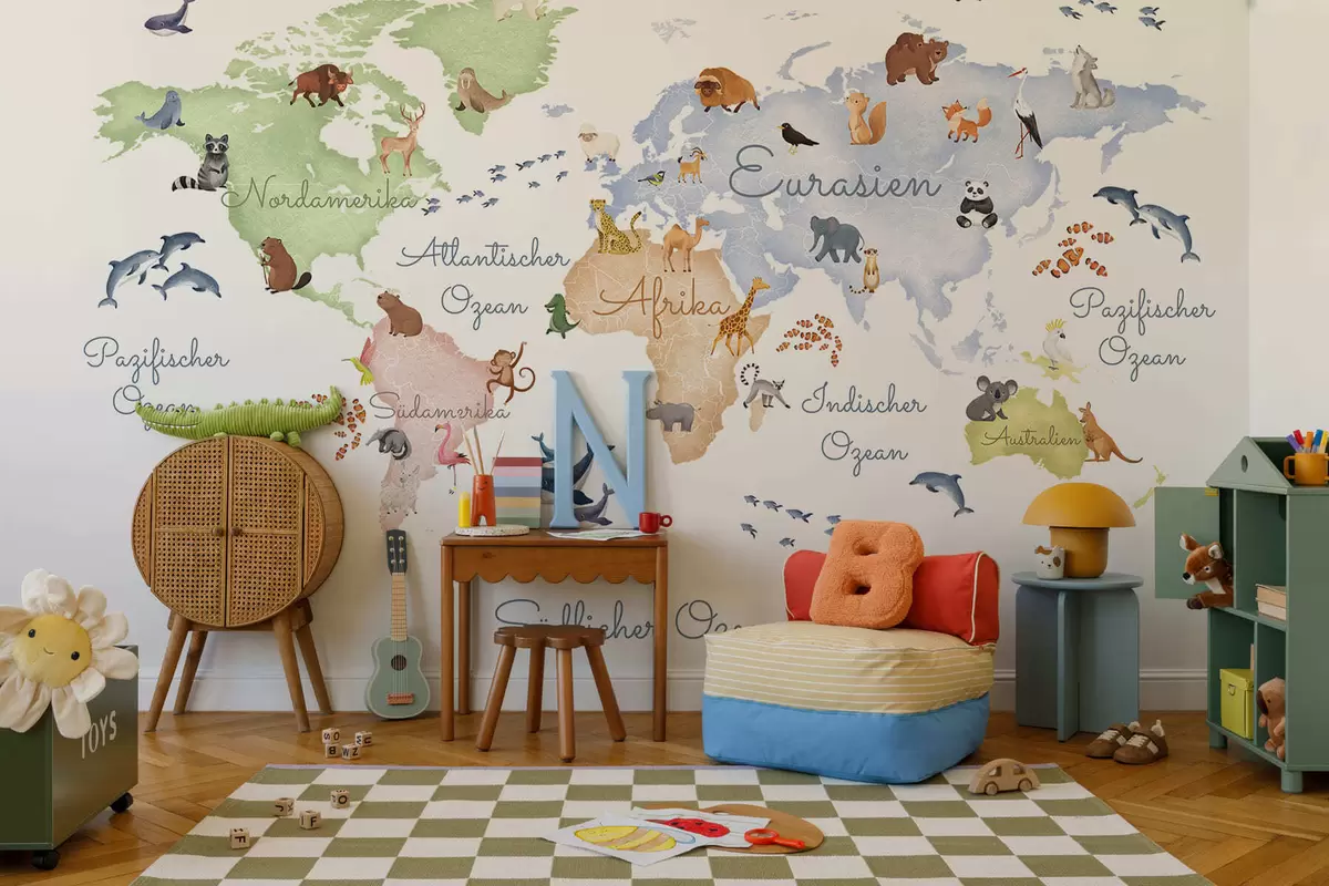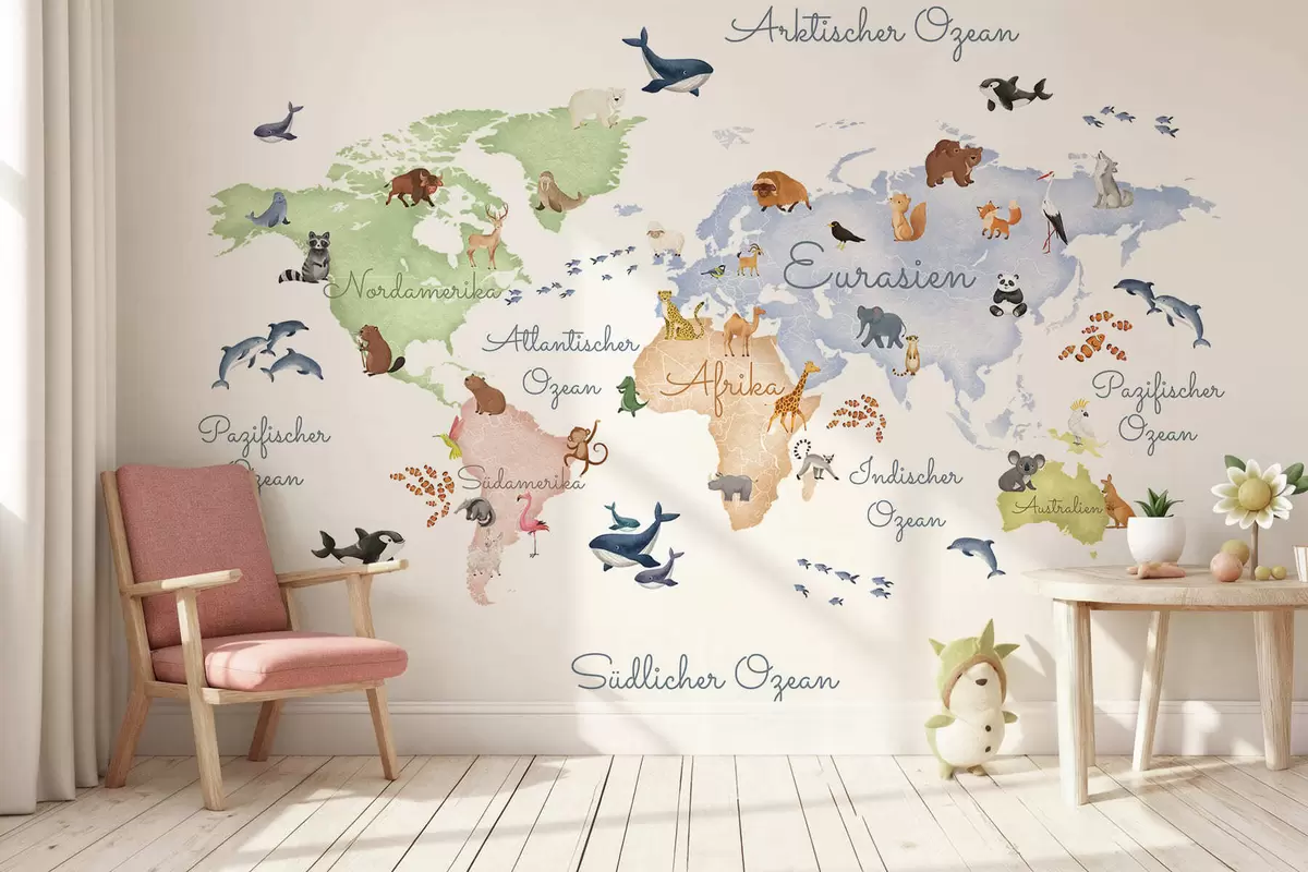 Тапете за зид Бела мапа у акварелу са животињама. Ознаке на немачком језику. бр. c00012de