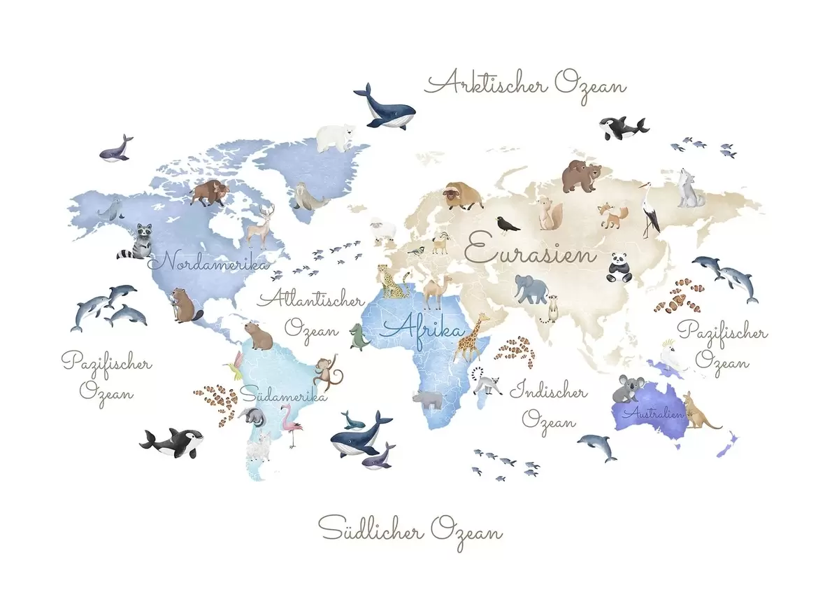 Тапете за зид Плава мапа у акварелу са животињама. Ознаке на немачком језику. бр. c00012dev1