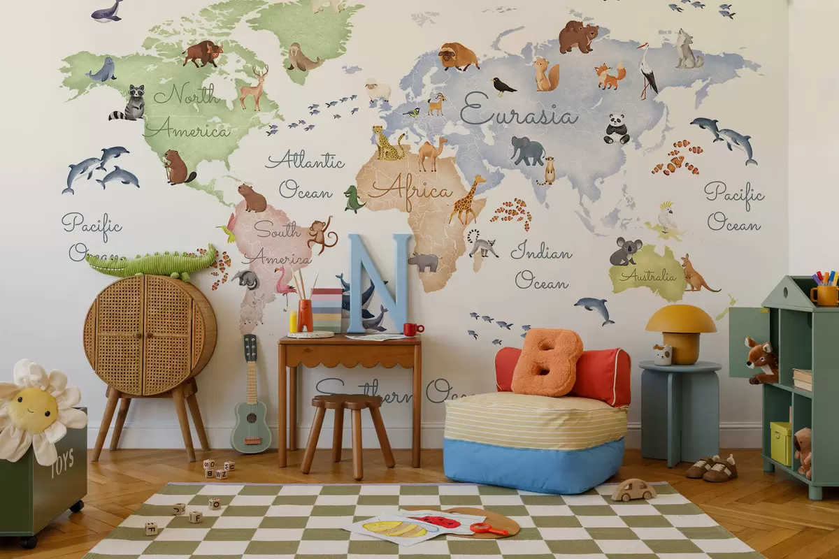 Тапете за зид Мапа у боји у акварелу са животињама. Ознаке на енглеском језику. бр. c00012en