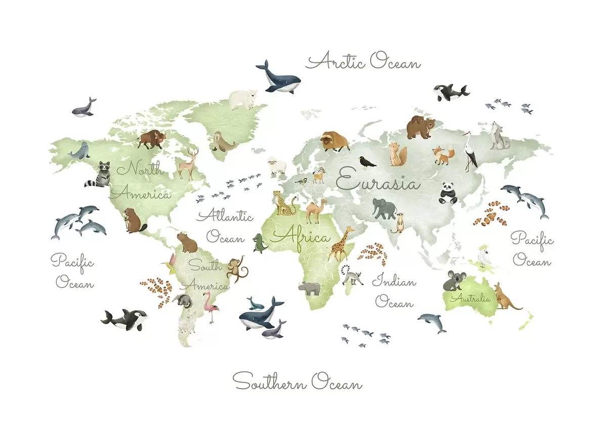 Тапете за зид Зелена мапа у акварелу са животињама. Ознаке на енглеском језику. бр. c00012env2