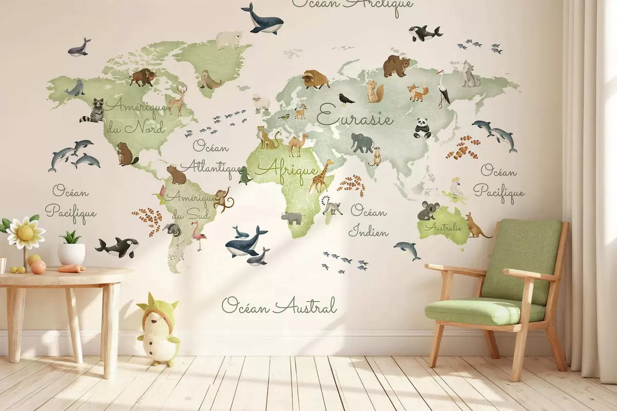 Тапете за зид Зелена мапа у акварелу са животињама. Ознаке на француском. бр. c00012frv2