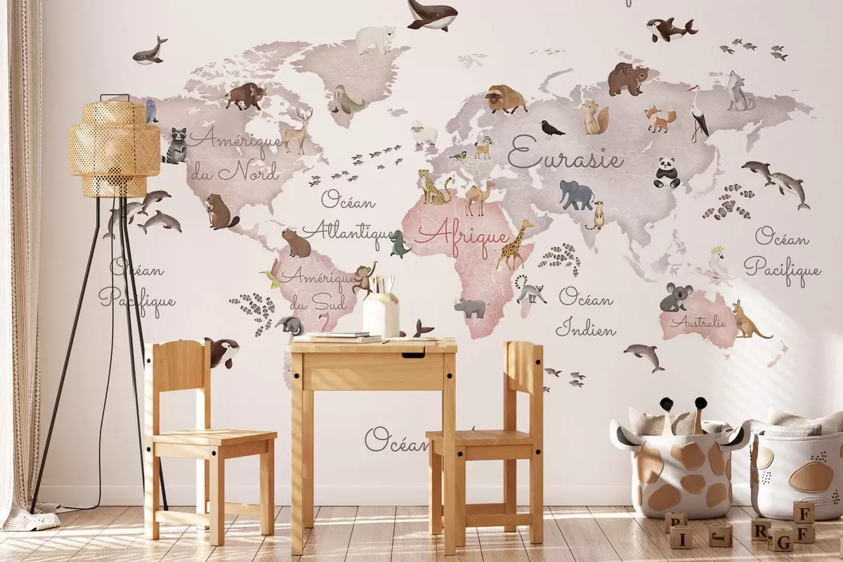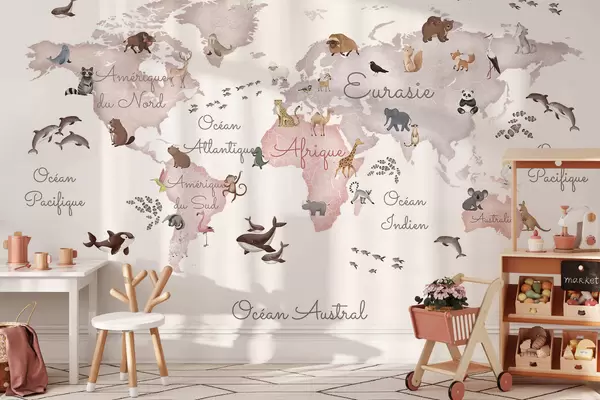 Тапете за зид Беж мапа у акварелу са животињама. Ознаке на француском. бр. c00012frv3