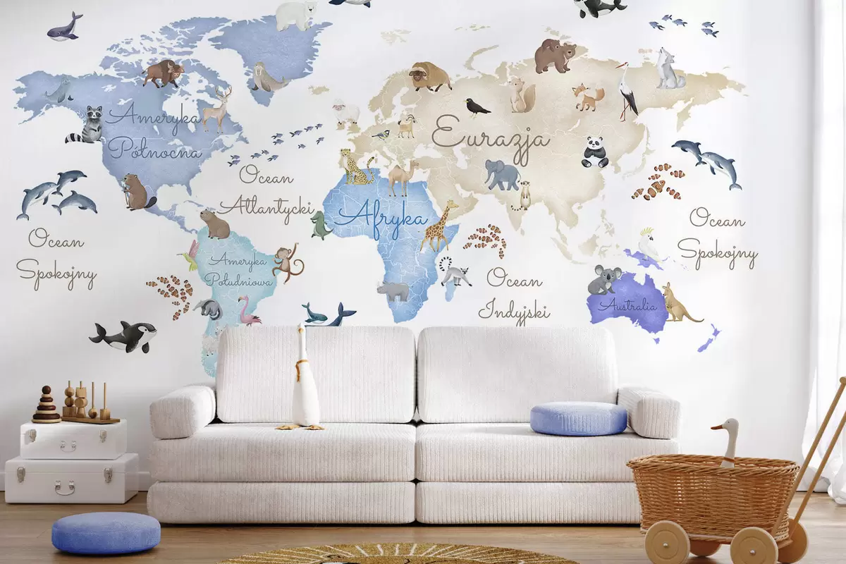 Тапете за зид Плава мапа у акварелу са животињама. Ознаке на пољском. бр. c00012plv1