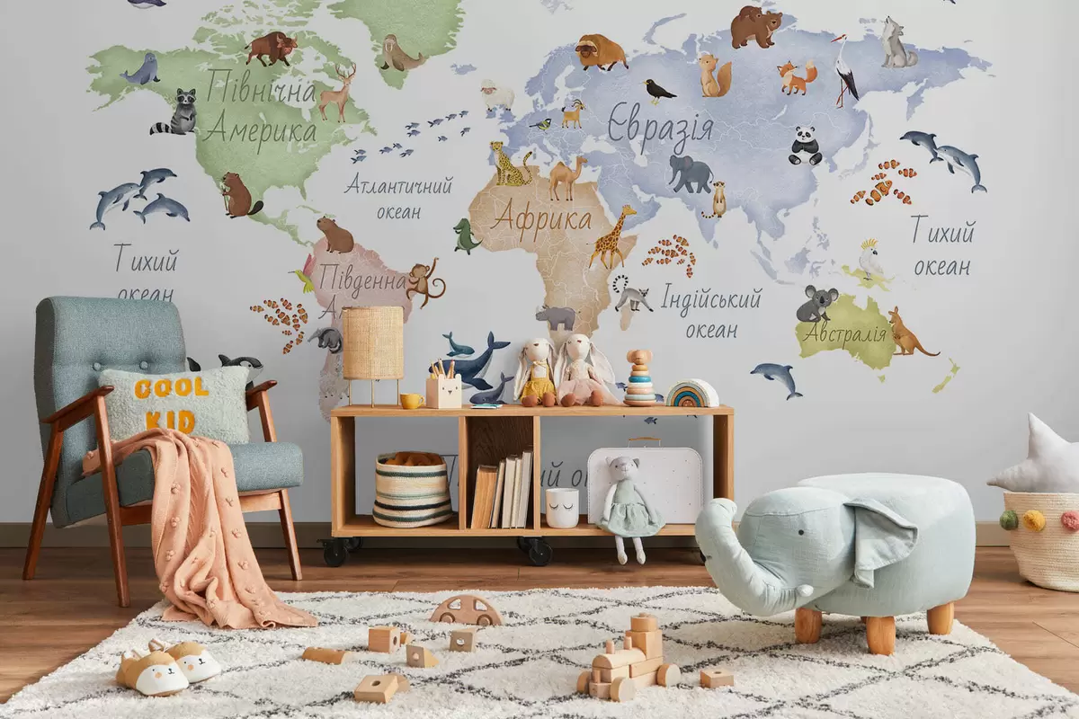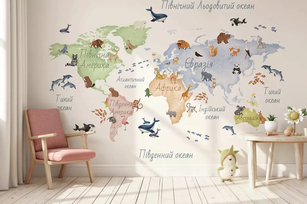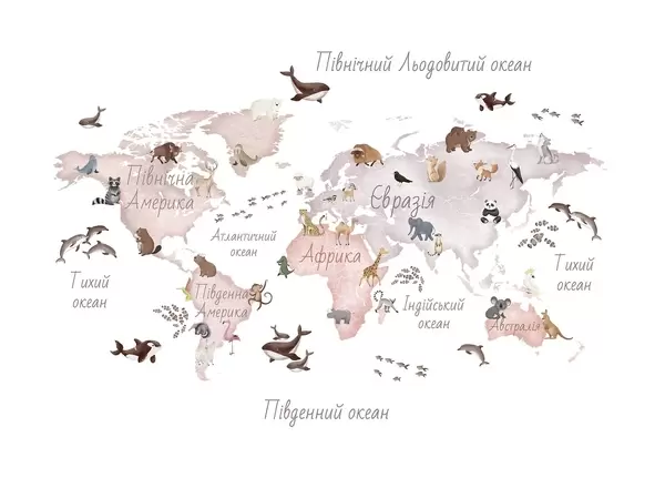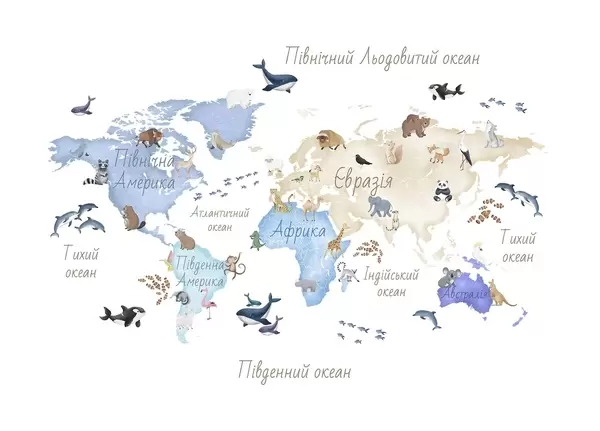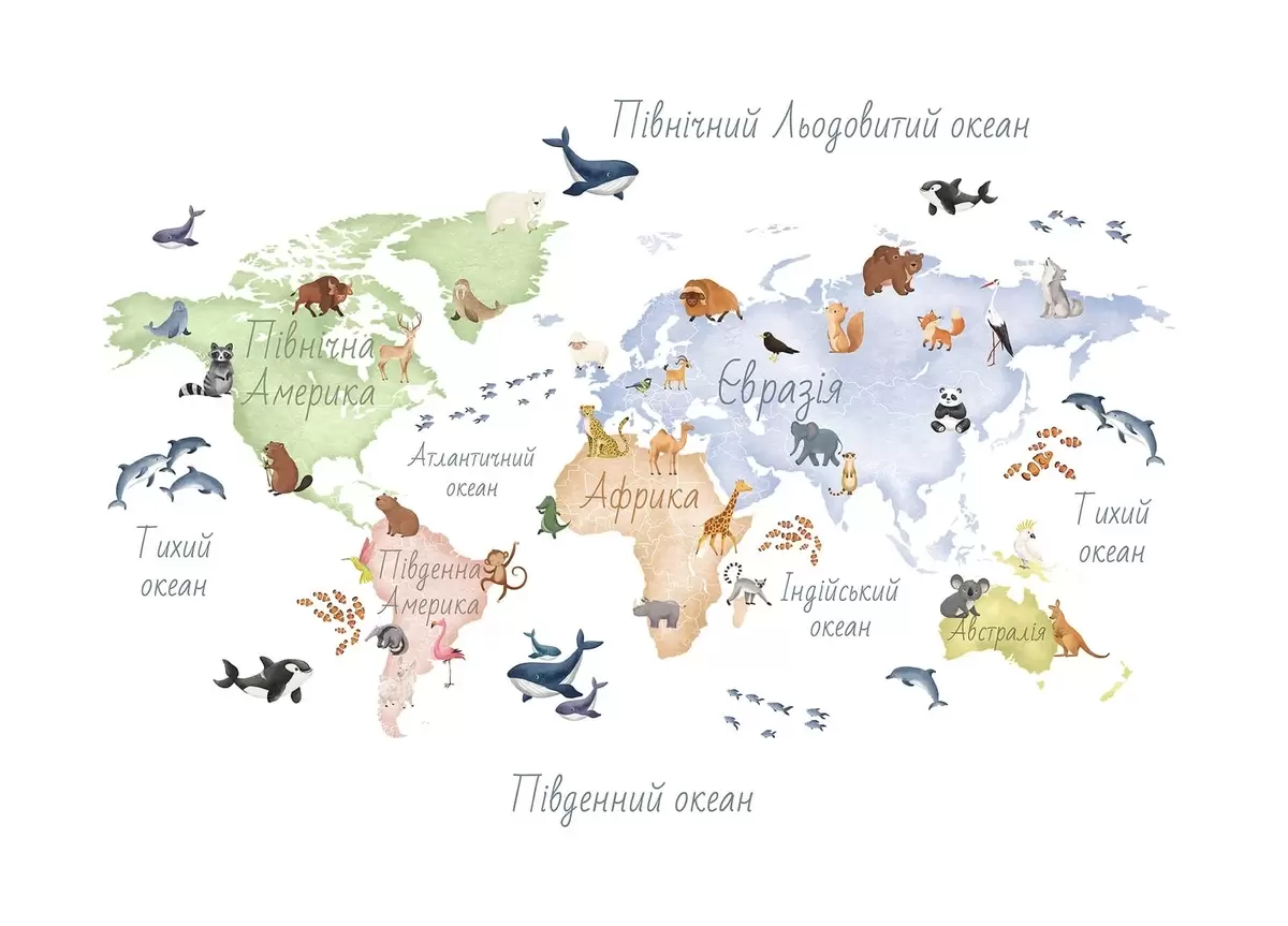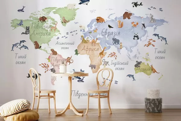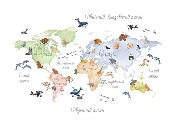 Тапете за зид Мапа у боји у акварелу са животињама. Ознаке на украјинском језику. бр. c00012uk