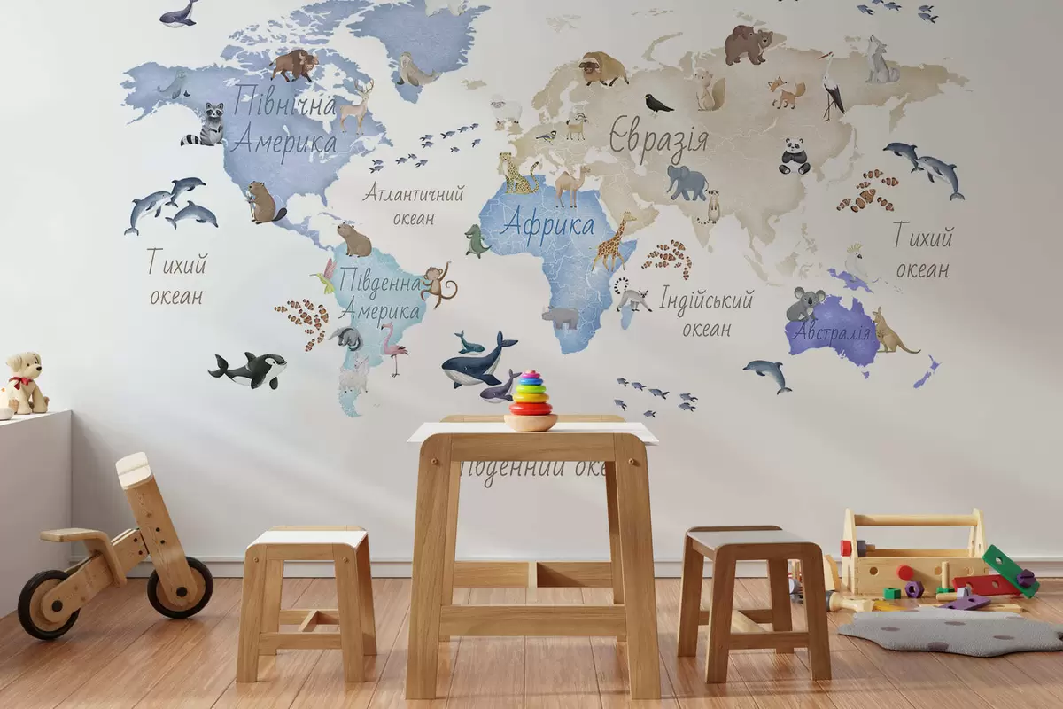 Тапете за зид Плава мапа у акварелу са животињама. Ознаке на украјинском језику. бр. c00012ukv1