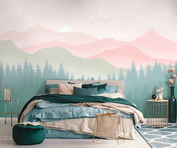 Тапете за зид Магловите планине са боровом шумом, меке природне боје, ружичаста и зелена бр. u98774