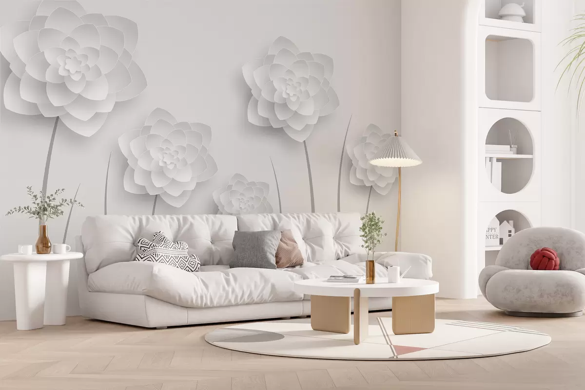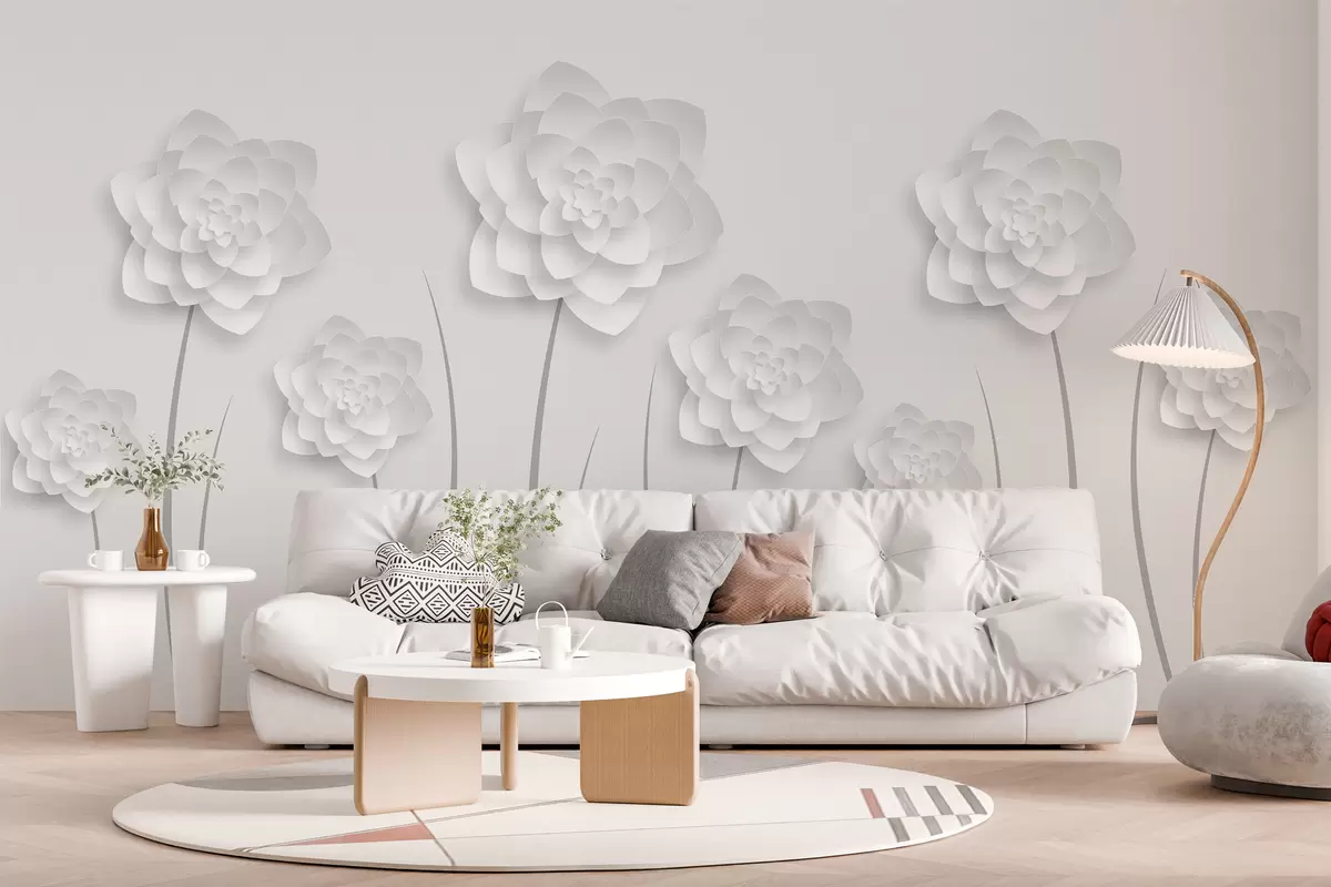Тапете за зид Велики цветови са имитацијом волумена у папирном стилу на светлосивој позадини са сивим стабљиком бр. w01021