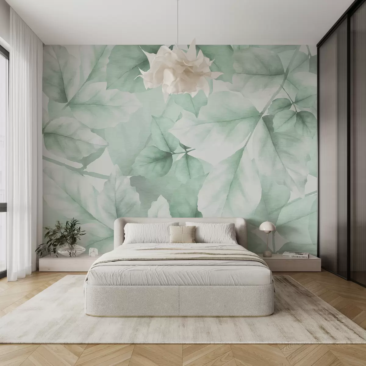 Тапете за зид Текстуриране тапете са великим листовима у пастелним нијансама зелене бр. w01090v3