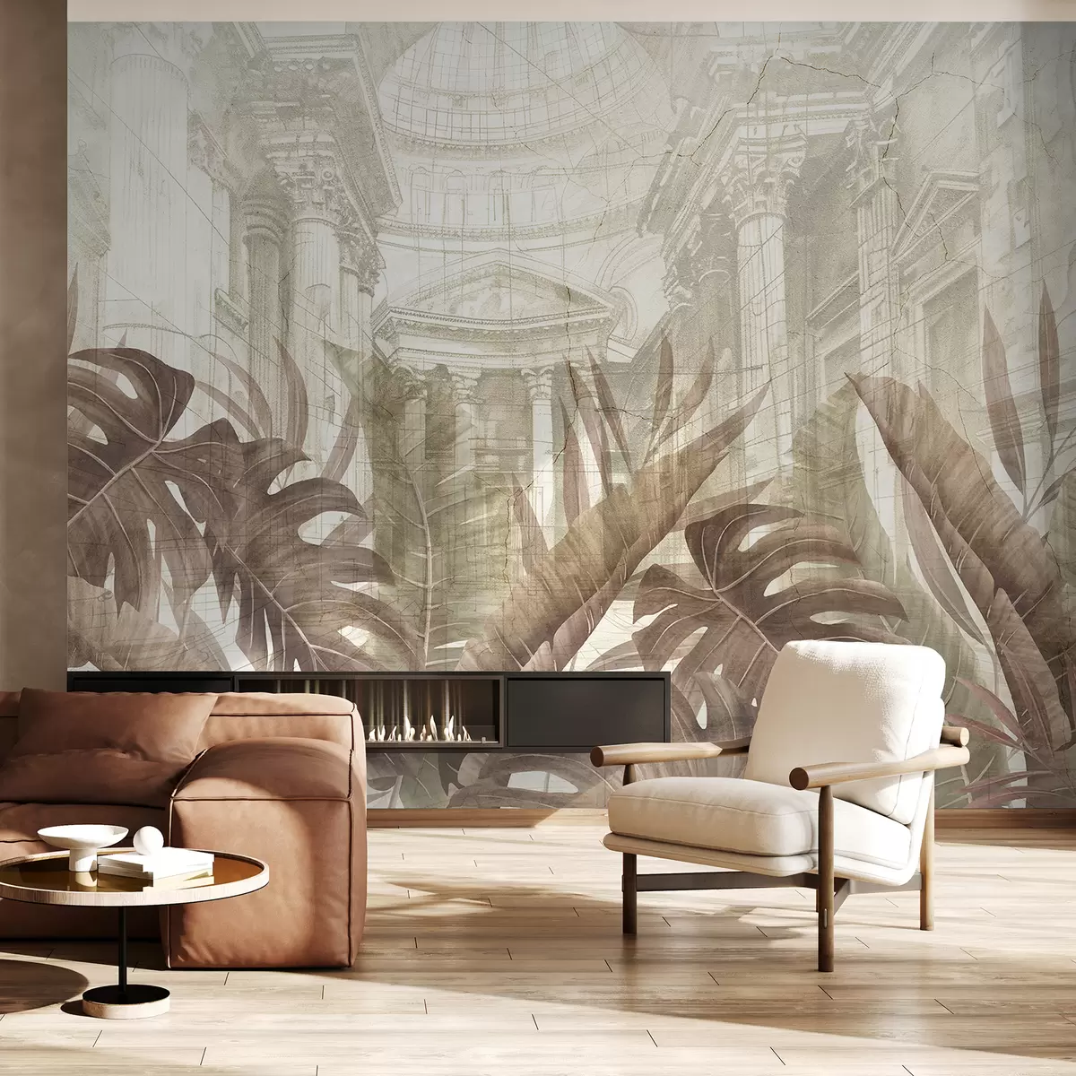 Тапете за зид Величанствени цртеж китњастих архитектонских мермерних стубова и бујних тропских биљака сепије бр. w01311v1