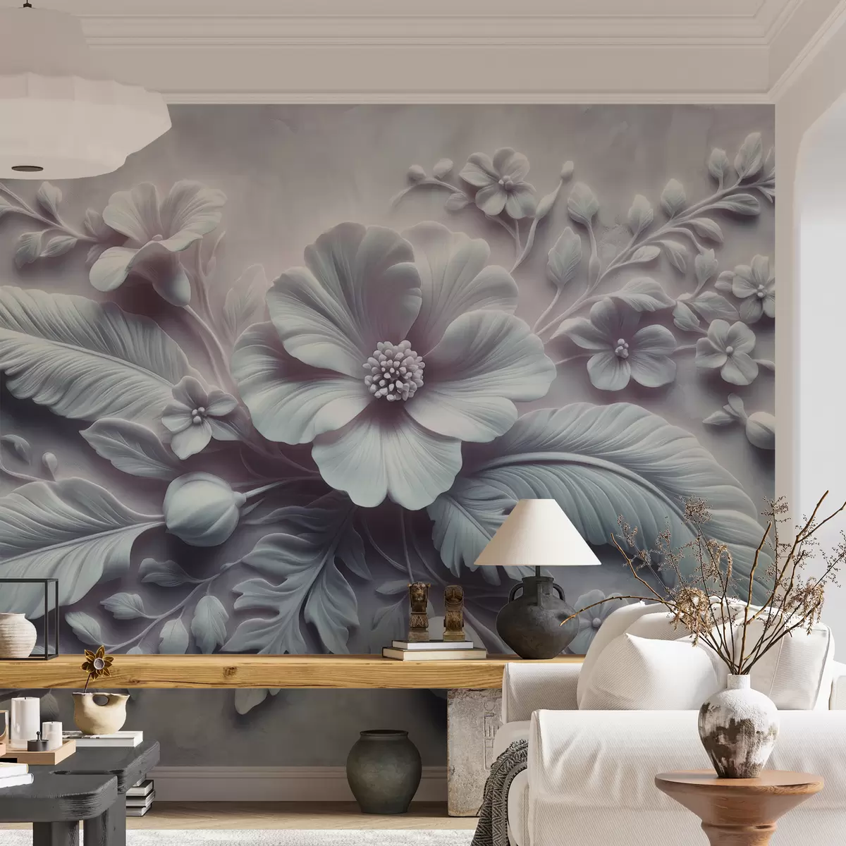 Тапете за зид 3Д рељефна зидна уметност са перјем и цвећем, са великим маком у светло плавим бојама бр. w01340v2