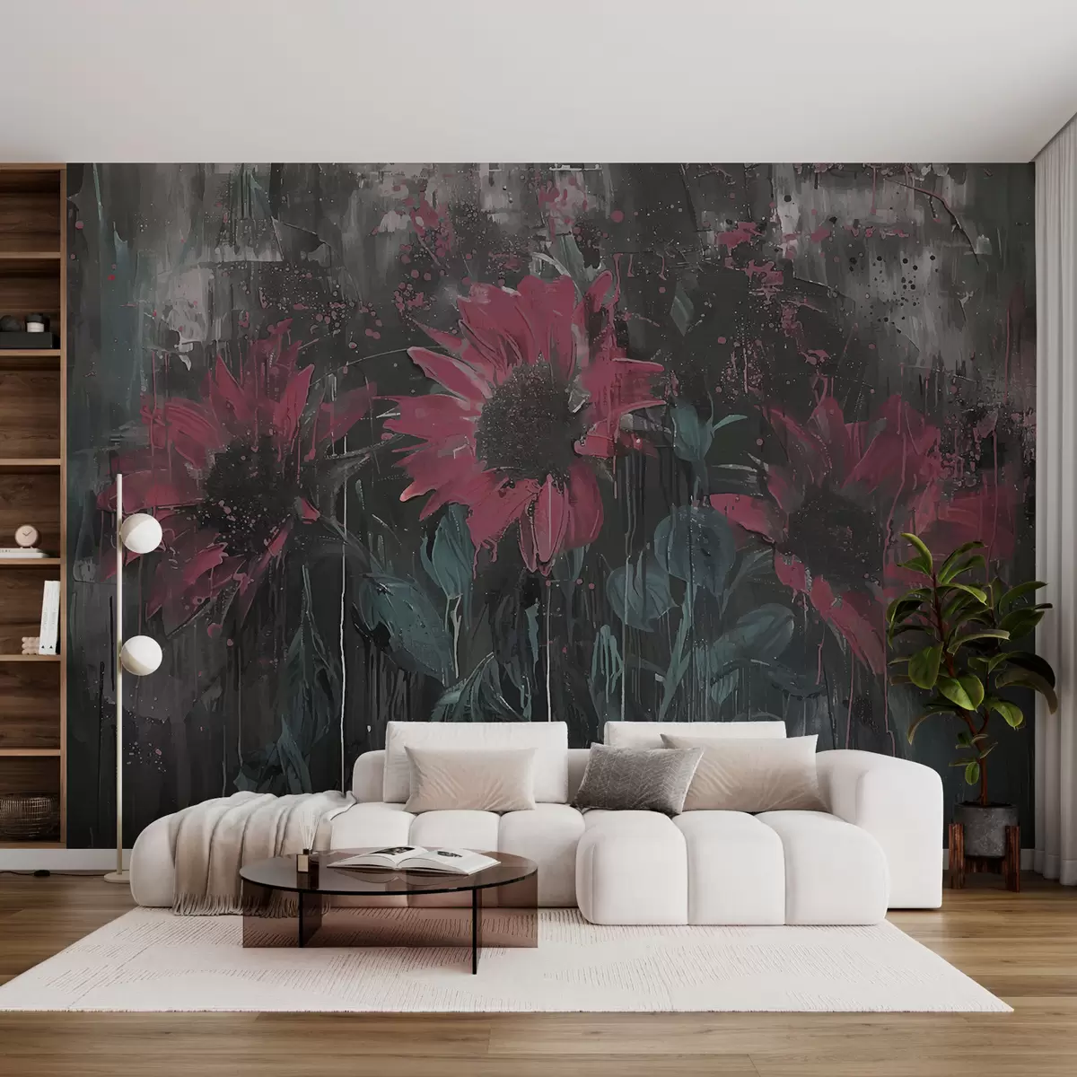Тапете за зид Апстрактна слика сунцокрета, тамно сива позадина и црвено-ружичасти тонови бр. w01480v1