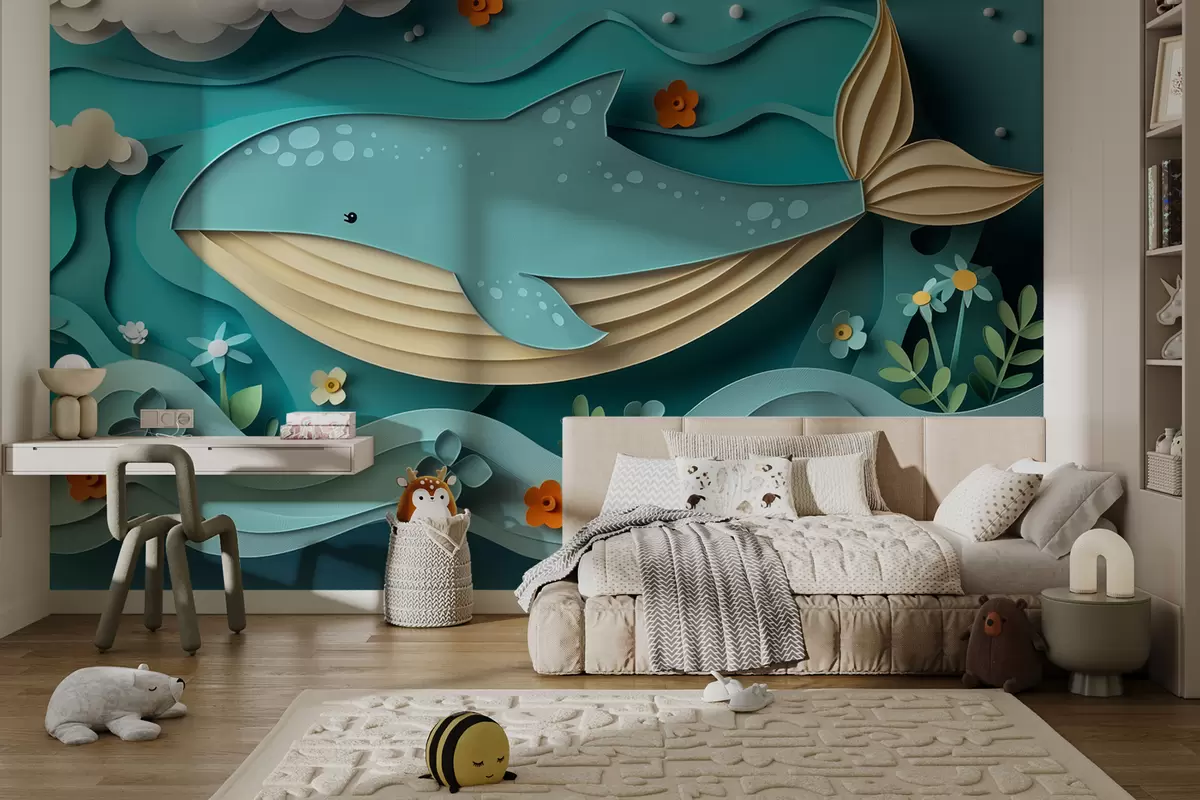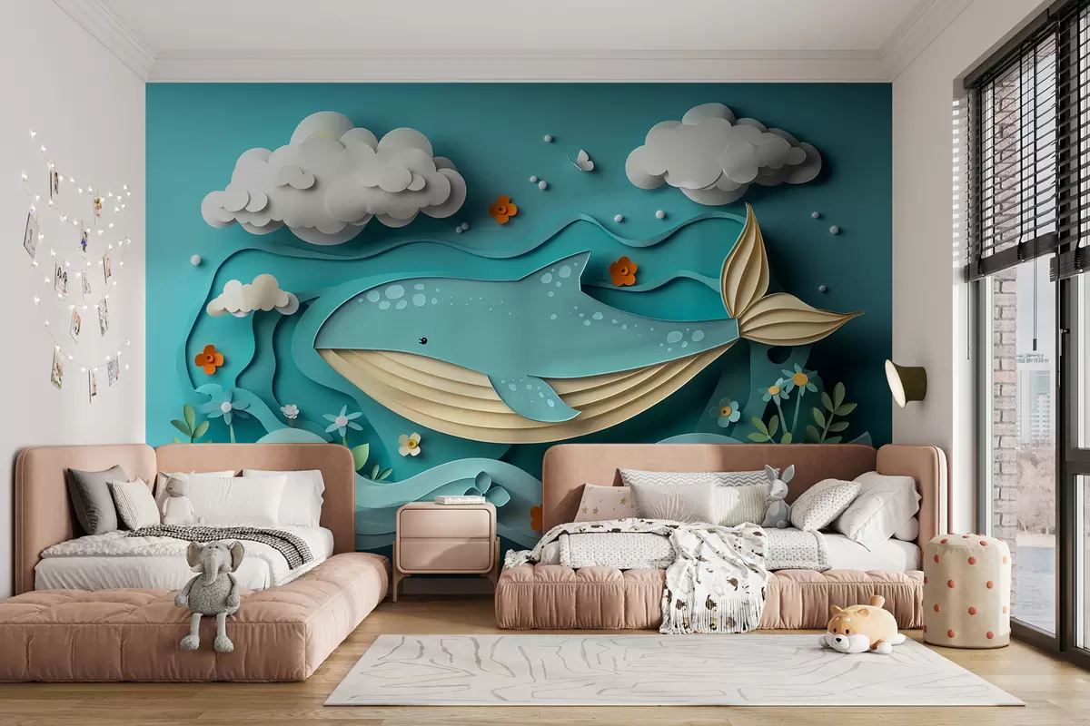 Тапете за зид Разиграни кит у облацима у стилу сечења папира, 3Д ефекат бр. w01496