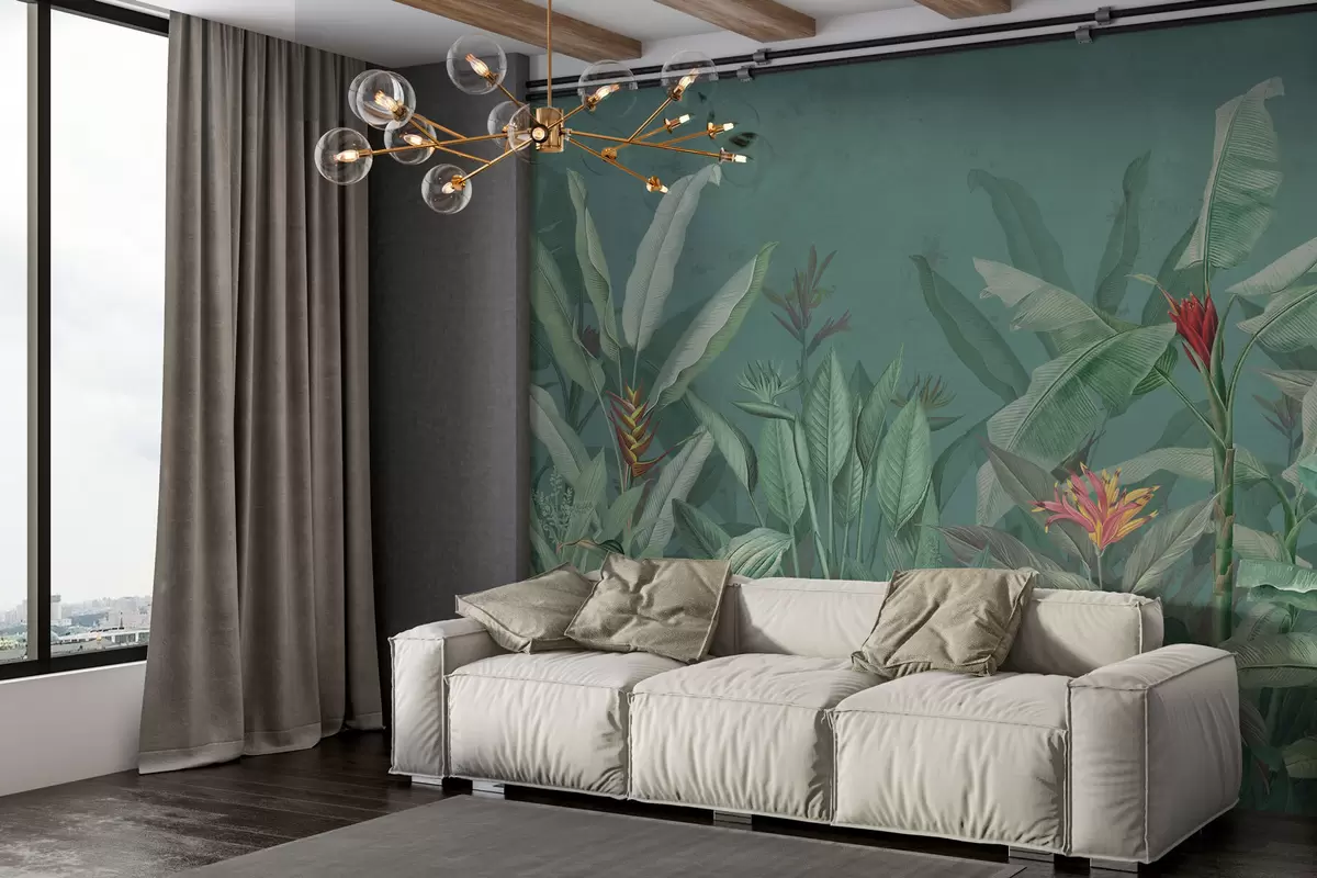 Тапете за зид Тропско лишће и цвеће на зеленој позадини бр. w01834v2