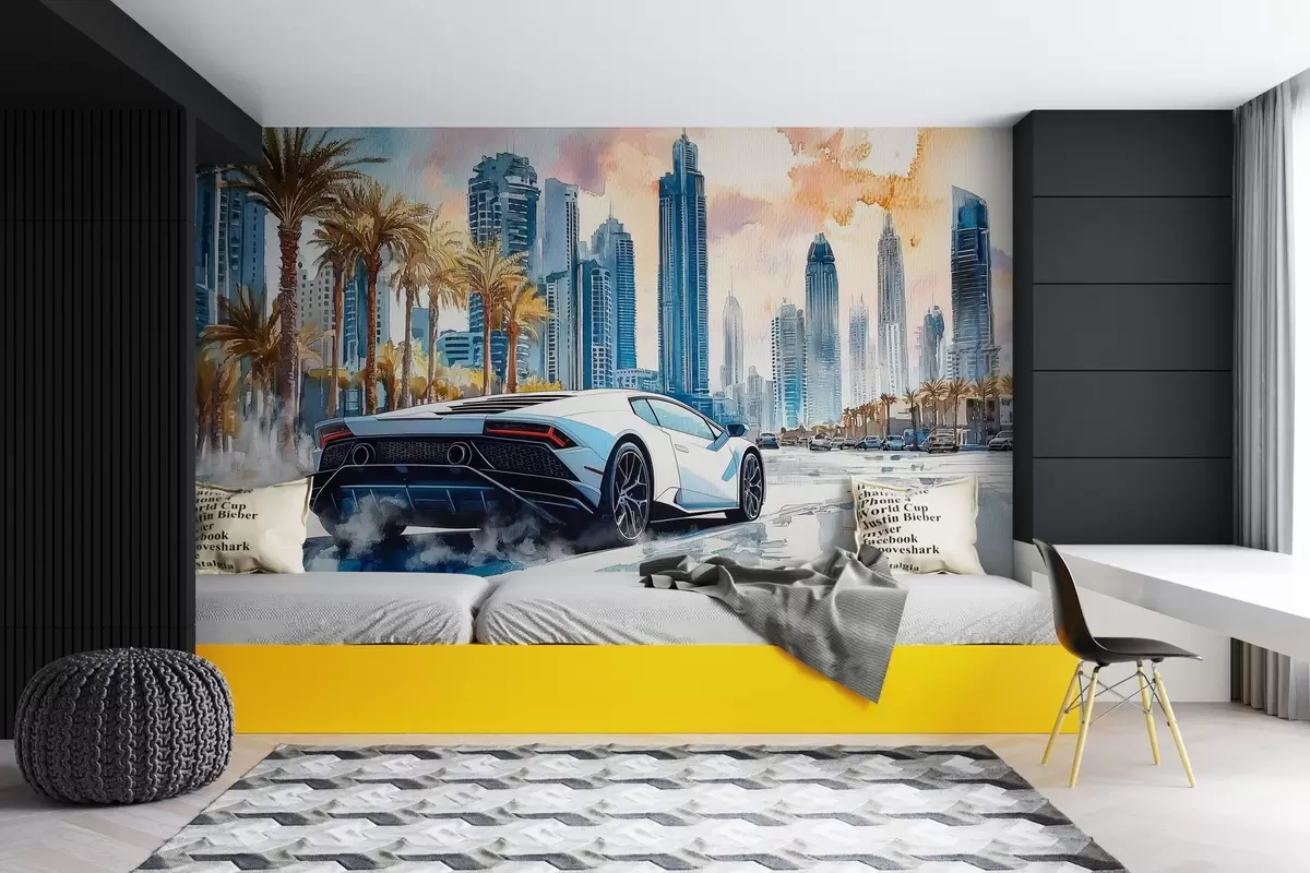 Тапете за зид Бели модерни спортски аутомобил који се трка на позадини палми и небодера у техници слободног акварела бр. w01963