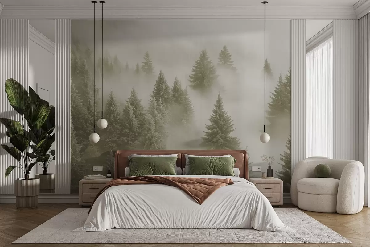 Тапете за зид Густа магла обавија снежну јутарњу шуму у меким зеленим нијансама бр. w02064v2