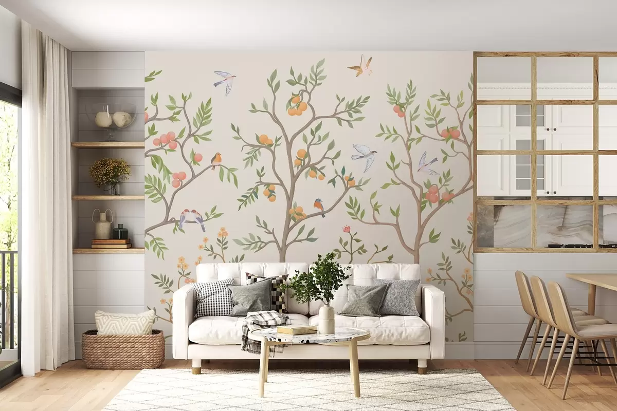 wall murals Цхиноисерие дизајн са птицама, вијугавим дрвећем, воћем и цвећем w02128